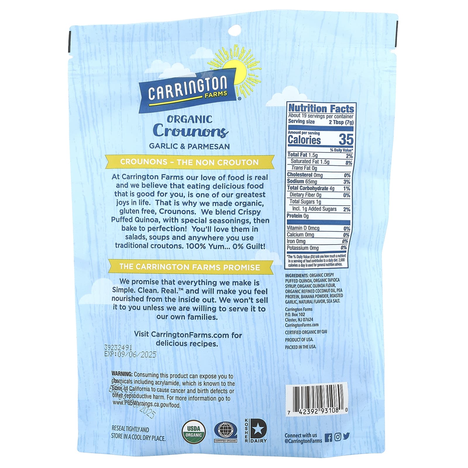В Carrington Farms мы по-настоящему любим еду и верим, что вкусная и полезная еда - одна из самых больших радостей в жизни. Вот почему мы сделали органические крауноны без глютена. Мы смешиваем хрустящую воздушную киноа с особыми приправами и выпекаем до совершенства! Вы полюбите их в салатах, супах и везде, где вы используете традиционные гренки. 100% вкусный ... 0% вины!