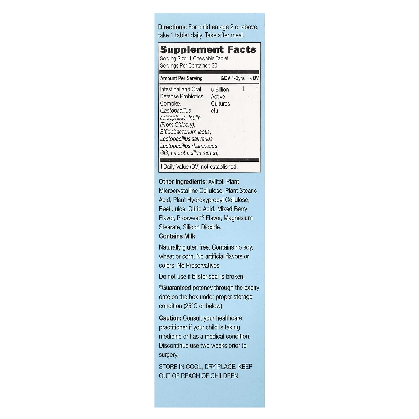 | Комплекс пробиотиков для защиты кишечника и полости рта (ацидофильные лактобактерии (Lactobacillus acidophilus), инулин (из цикория), бифидобактерии лактис (Bifidobacterium lactis), лактобактерии саливариус (Lactobacillus salivarius), лактобактерии рамнозус GG (Lactobacillus rhamnosus GG), лактобактерии реутери) | 5 млрд КОЕ активных культур | † | † |