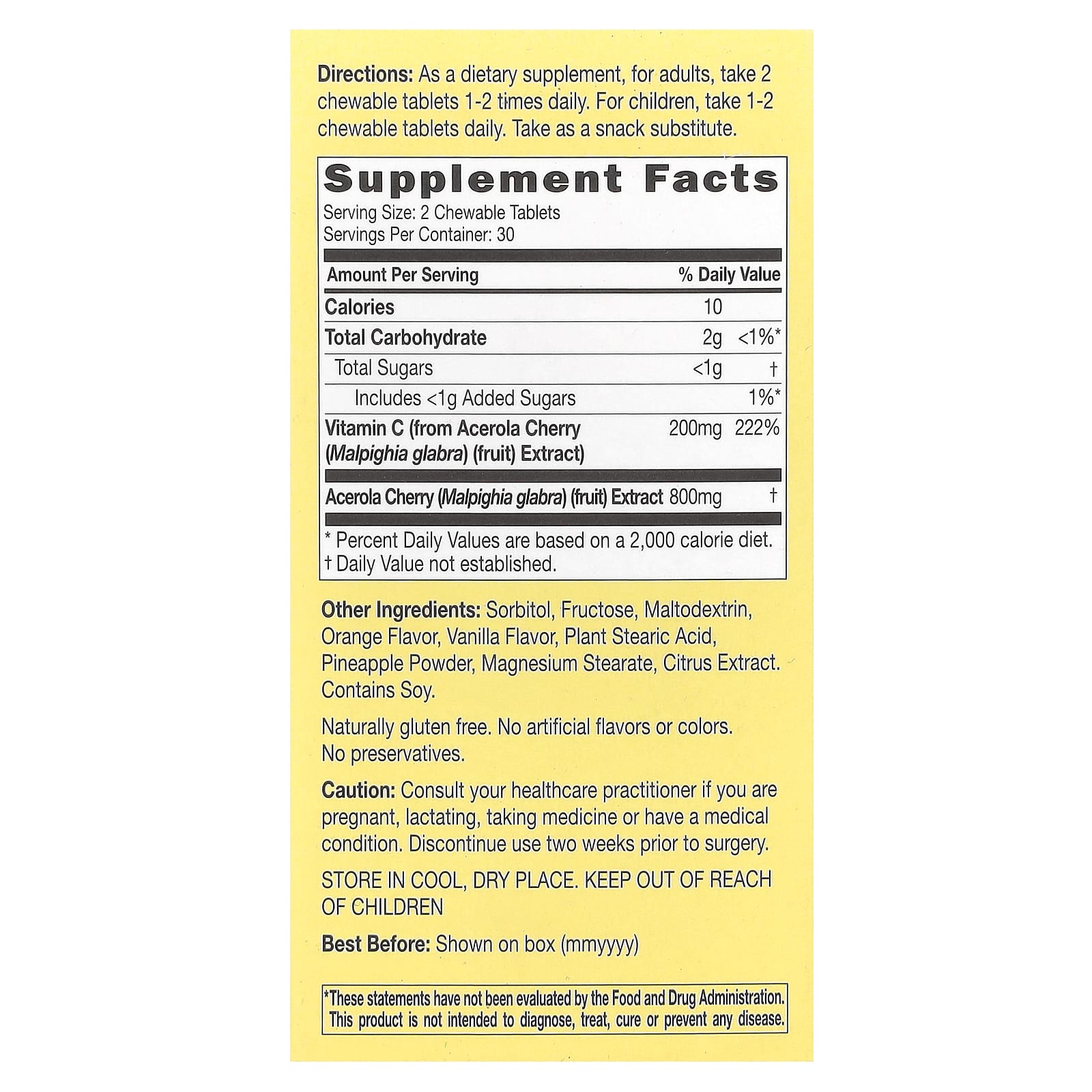 Вишня ацерола - натурального происхождения, производится в «жевательной» форме с восхитительным вкусом апельсина и ананаса.