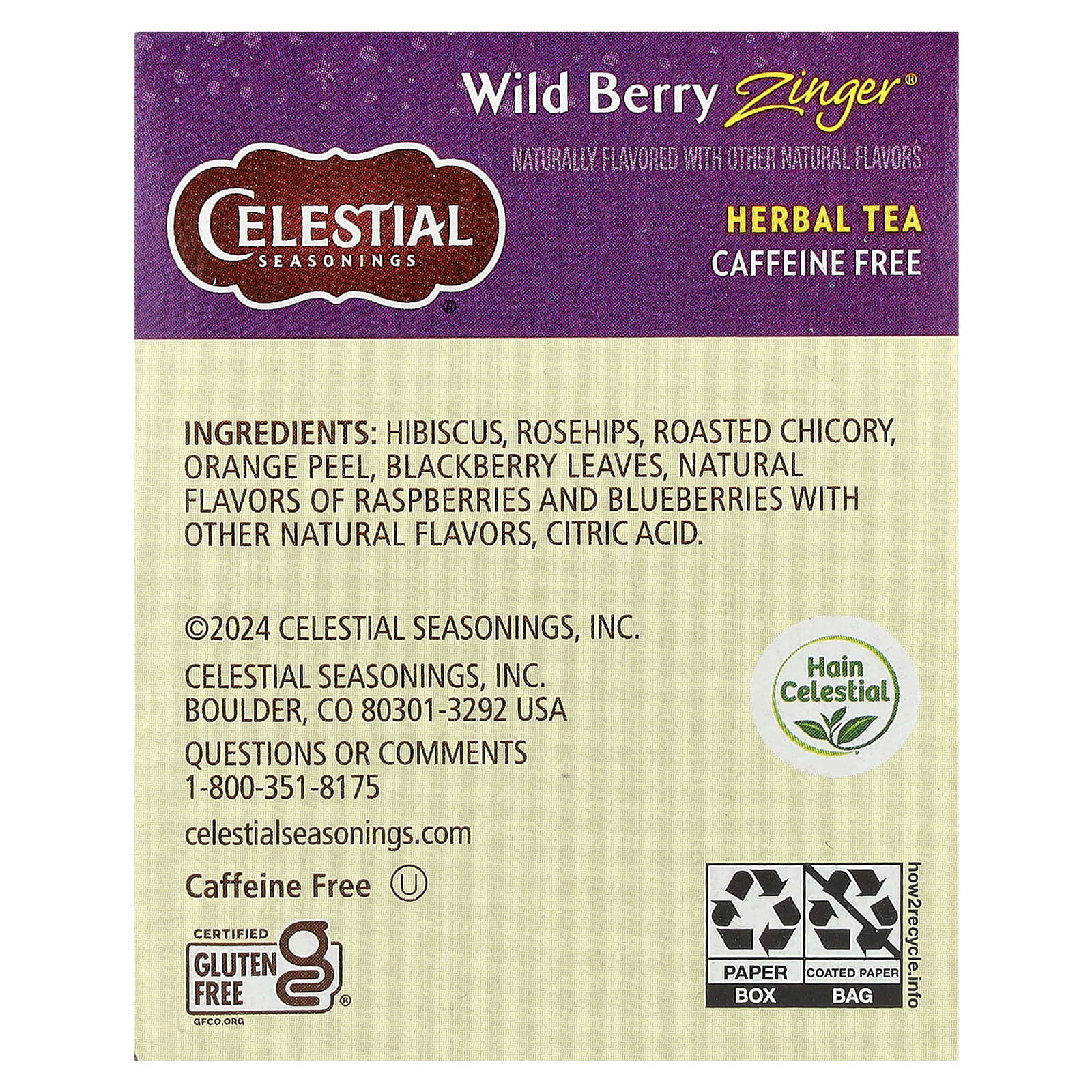 Гибискус, плоды шиповника, жареный цикорий, апельсиновая цедра, листья ежевики, натуральные ароматизаторы малины и голубики с другими натуральными ароматизаторами, лимонная кислота.