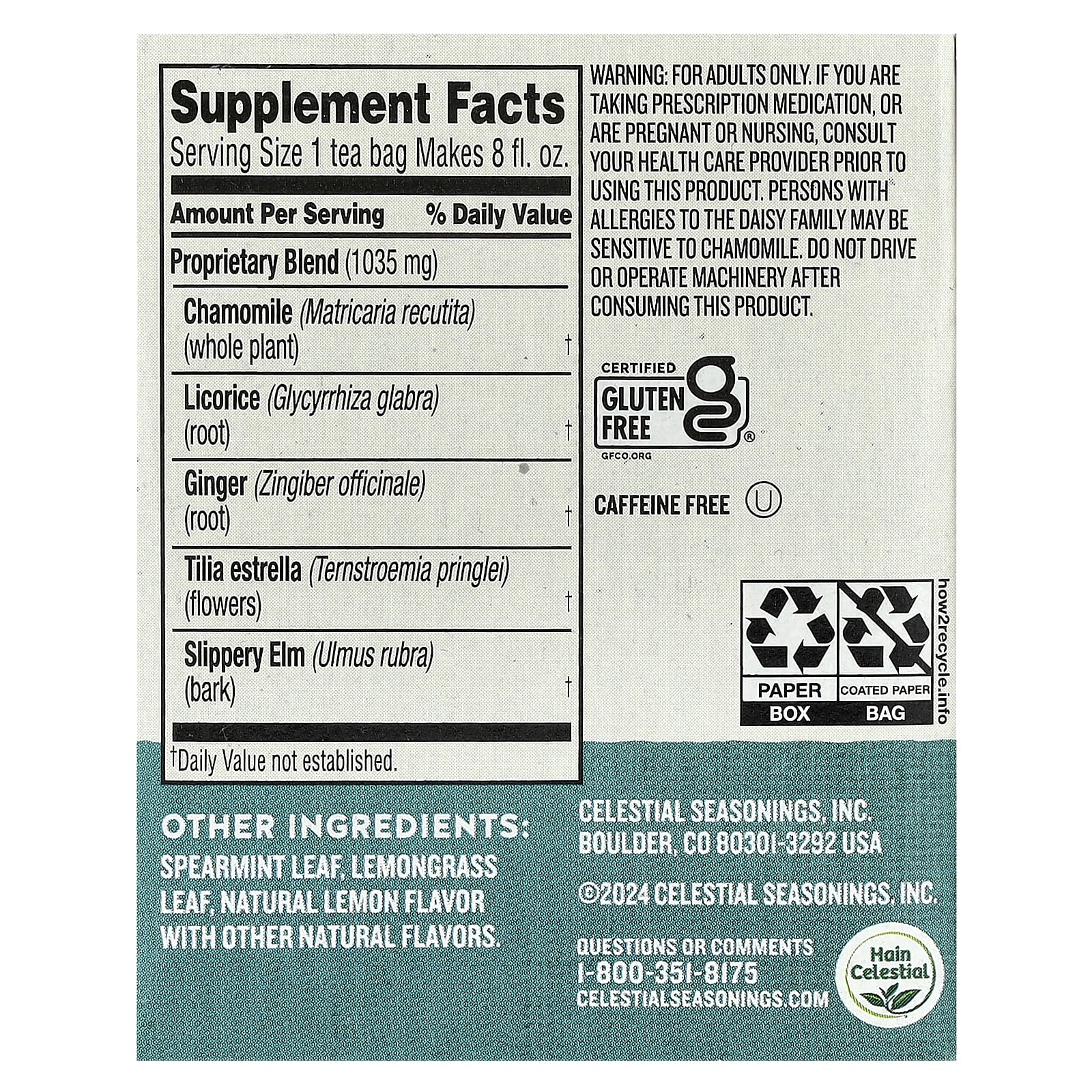 Только для взрослых. Если вы принимаете рецептурные лекарства, беременны или кормите грудью, проконсультируйтесь с врачом перед использованием этого продукта. Люди, страдающие аллергией на ромашки, могут быть чувствительны к ромашке. Не садитесь за руль и не работайте с механизмами после употребления этого продукта.