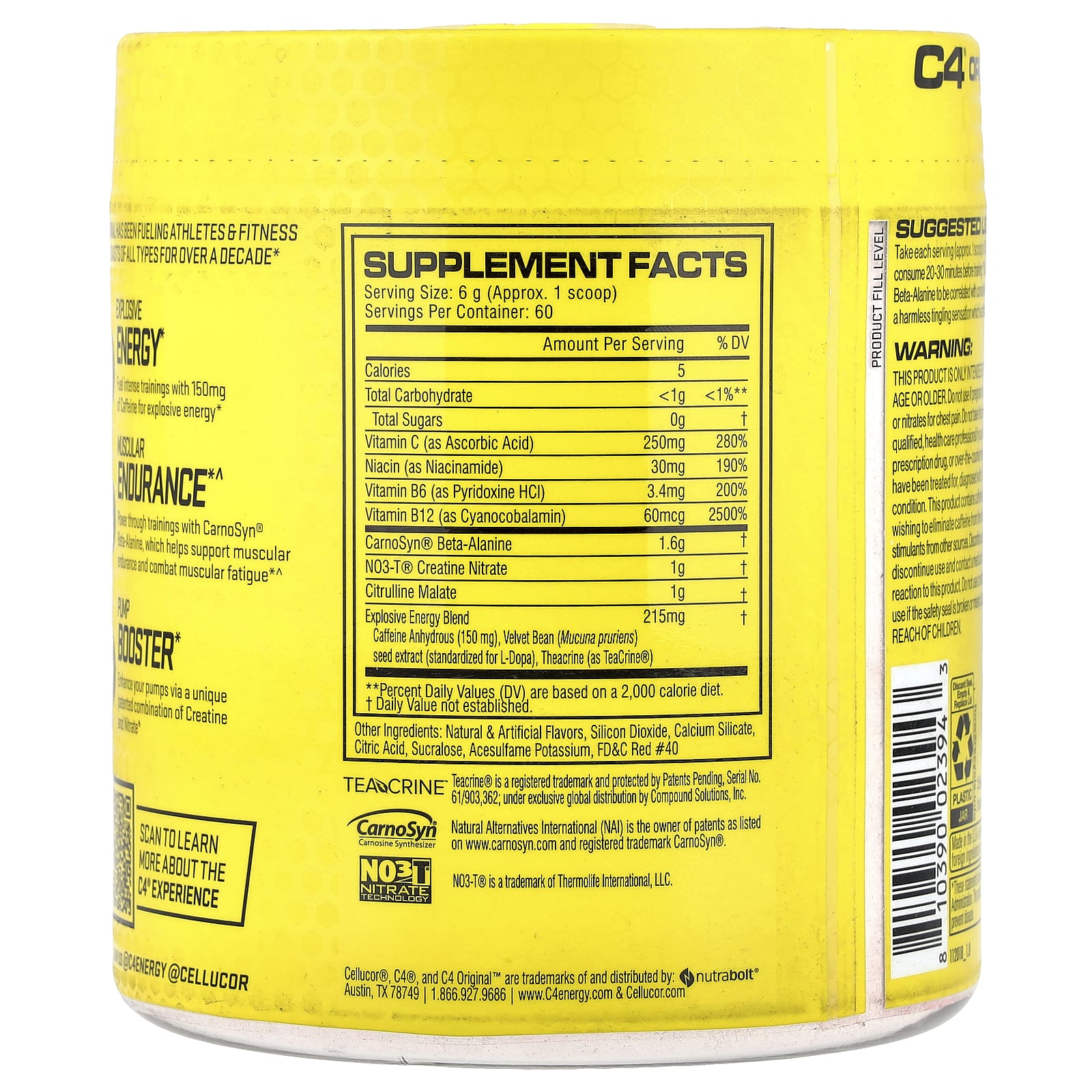 Принимать каждую порцию (прибл. 1 мерную ложку) C4® Original смешанную с 180 мл (6 жидк. унциями) воды за 20–30 минут до тренировки. Исследования показали, что преимущества бета-аланина CarnoSyn® связаны с его накопительным эффектом^. Некоторые люди могут испытывать легкое покалывание, вызванное бета-аланином. Это безвредно.