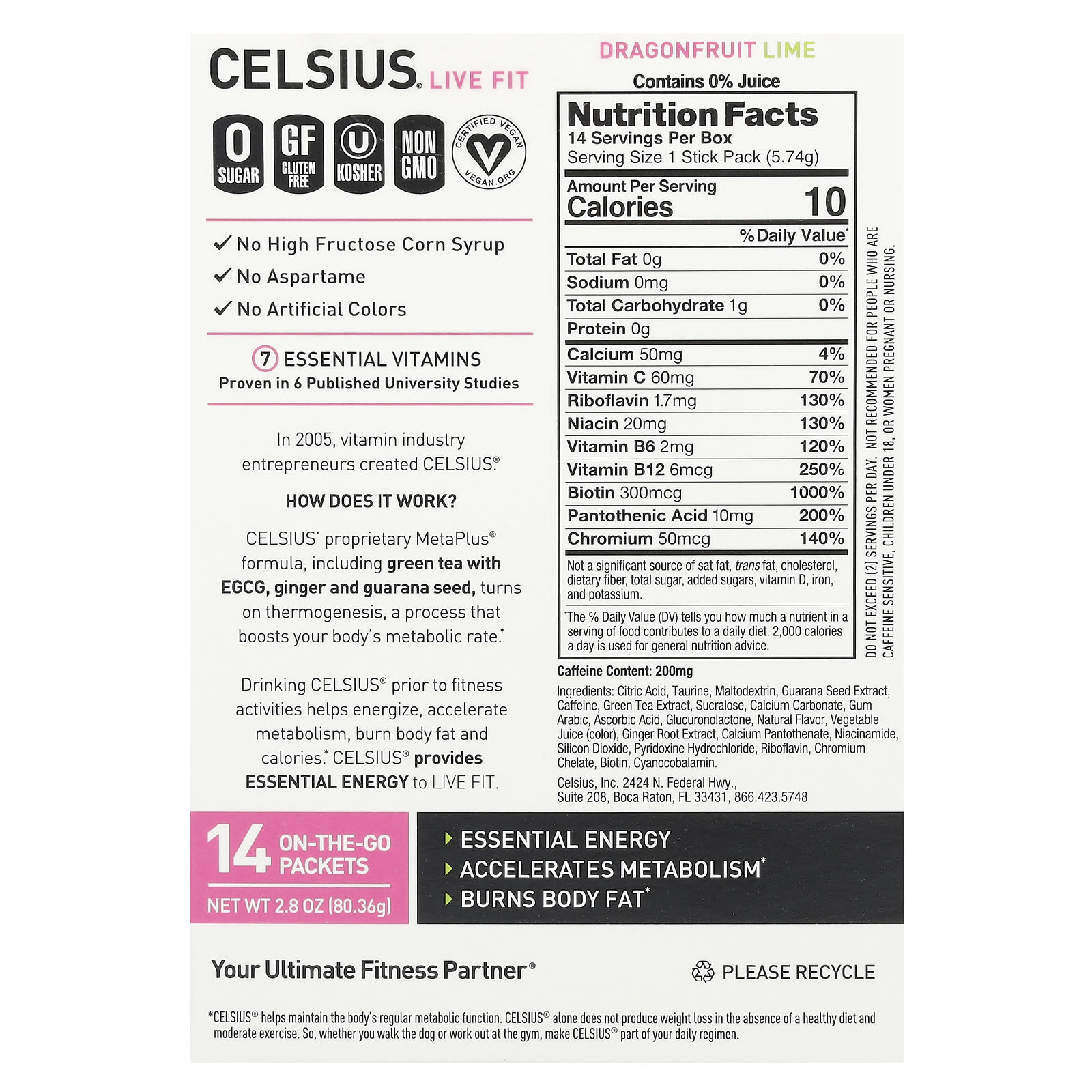 Celsius, Live Fit, драконий фрукт и лайм, 14 пакетиков по 5,74 г (0,2 унции)