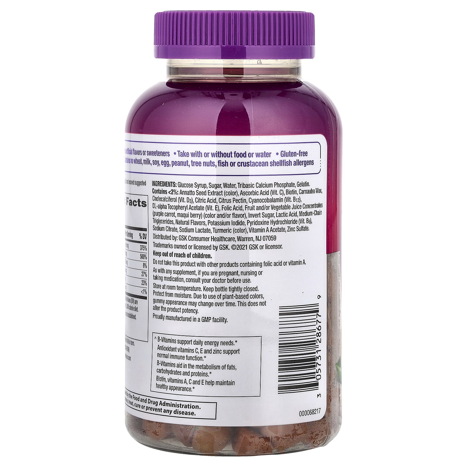 Крахмальная патока, сахар, Вода, трехзамещенный фосфат кальция, желатин.Содержит < 2% экстракта семян аннато (краситель), аскорбиновая кислота (витамин С), биотин, карнаубский воск, холекальциферол (витамин D3), лимонная кислота, цитрусовый пектин, цианокобаламин (витамин B12), dl-альфа токоферилацетат (витамин Е), фолиевая кислота, концентраты фруктовых и/или овощных соков (фиолетовая морковь, ягоды чилийской аристотелии) (краситель и/или ароматизатор), инвертный сахар, молочной кислоты, среднецепочечные триглицериды, натуральные ароматизаторы, йодид калия, пиридоксина гидрохлорид (витамин B6), цитрат натрия, лактат натрия, куркума (краситель), ацетат витамина A, сульфат цинка.