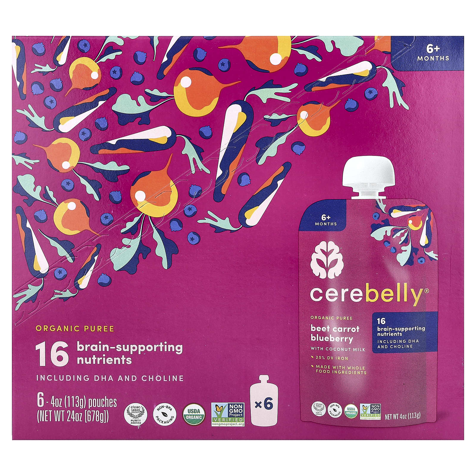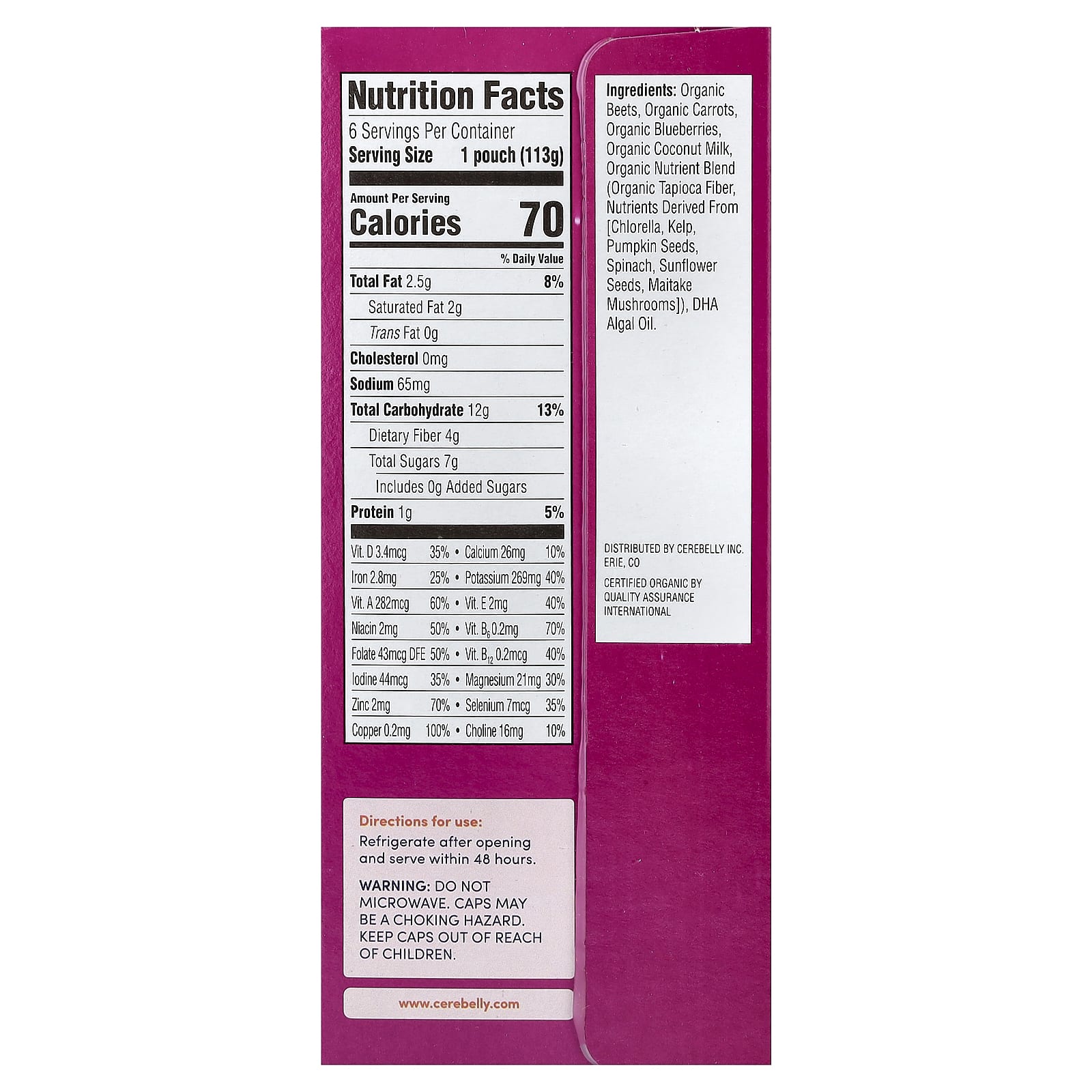 Органическая свекла, органическая морковь, органическая черника, органическое кокосовое молоко, смесь органических питательных веществ (органическая тапиоковая клетчатка, питательные вещества, полученные из [хлореллы, морские водоросли, семена тыквы, шпинат, семена подсолнечника, гриб-баран]), масло водорослей ДГК.