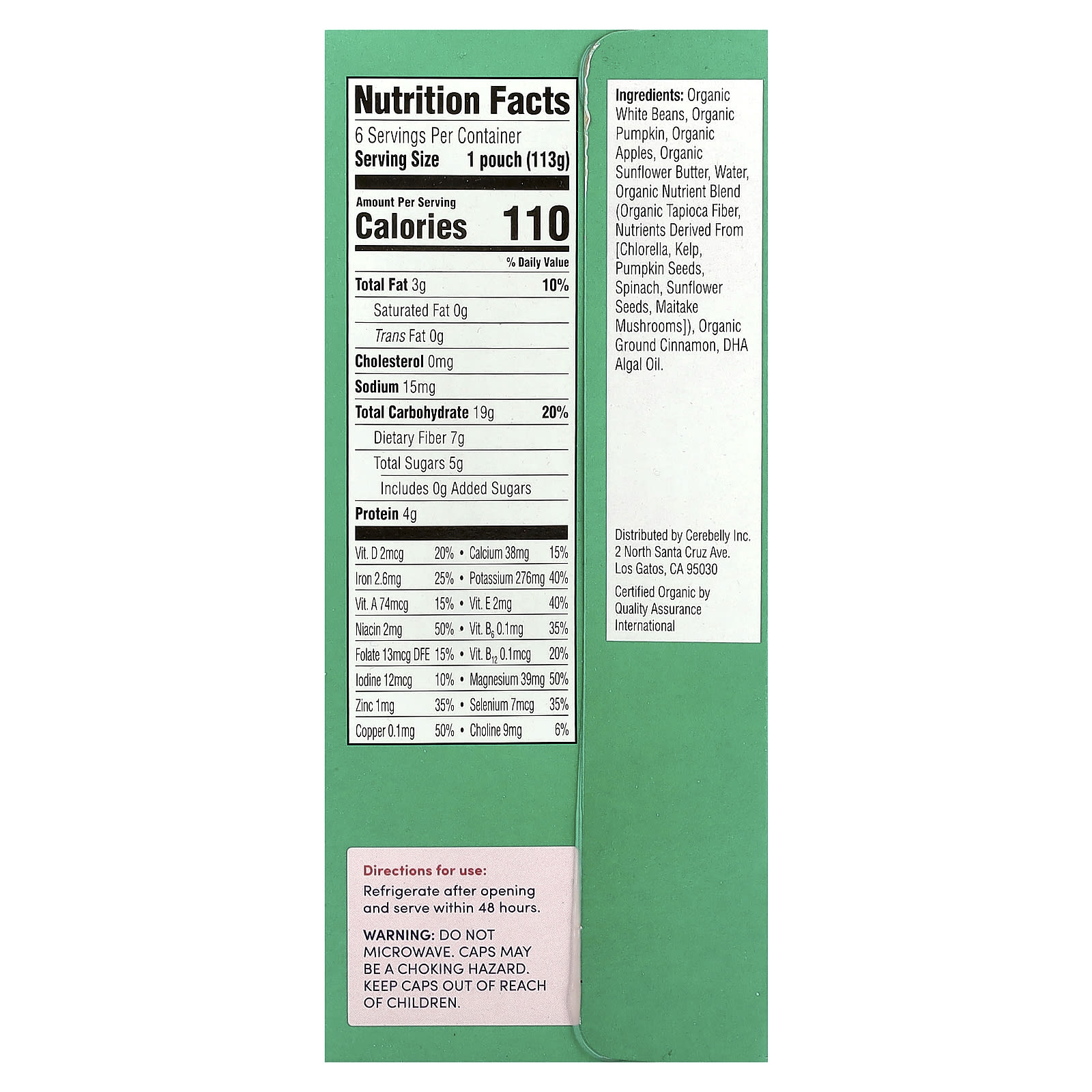 Органическая белая фасоль, органическая тыква, органические яблоки, органическое подсолнечное масло, вода, смесь органических питательных веществ (органическая тапиоковая клетчатка, питательные вещества, полученные из [хлореллы, морские водоросли, семена тыквы, шпинат, семена подсолнечника, грибы майтаке]), органическая молотая корица, масло водорослей дха.