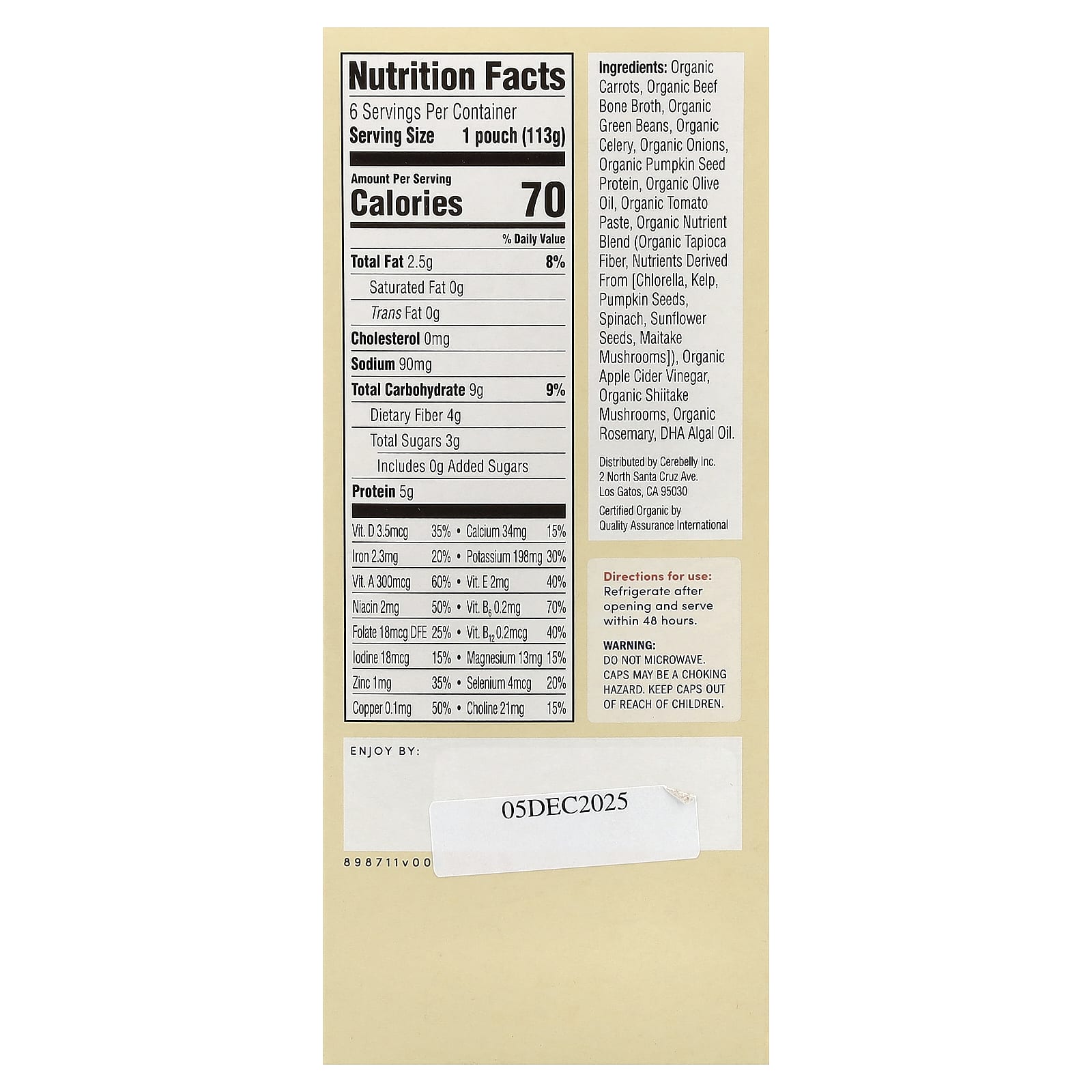 Органическая морковь, органический бульон из говяжьих костей, органическая стручковая фасоль, органический сельдерей, органический лук, органический протеин из семян тыквы, органическое оливковое масло, органическая томатная паста, смесь органических питательных веществ (органическая тапиоковая клетчатка, питательные вещества, полученные из [хлореллы, морские водоросли, семена тыквы, шпинат, семена подсолнечника, грибы майтаке]), органический яблочный уксус, органические грибы шиитаке, органический розмарин, масло водорослей дха.