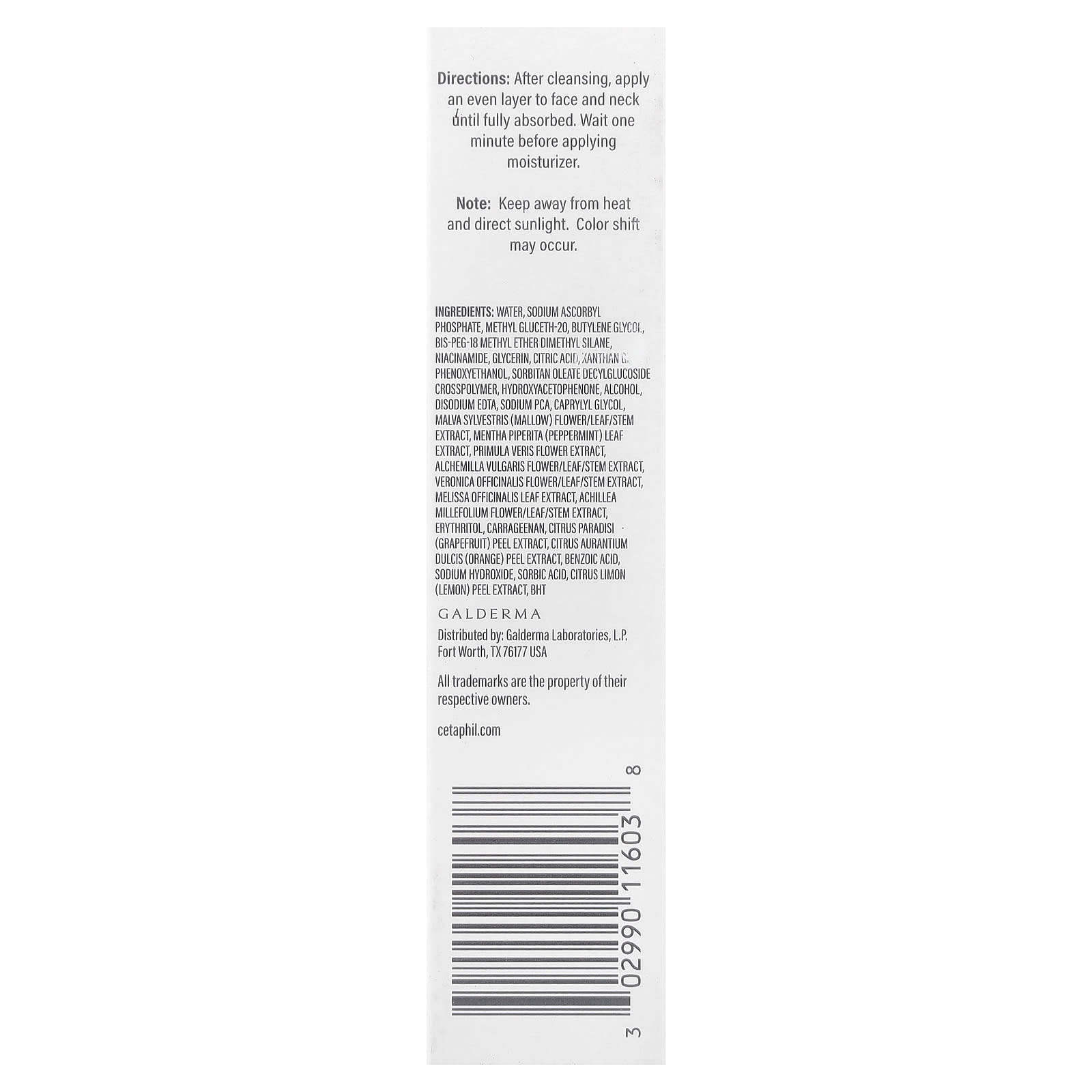 Вода, аскорбил фосфат натрия, метил глюцет-20, бутиленгликоль, бис-ПЭГ-18 метиловый эфир, диметилсилан, ниацинамид, глицерин, лимонная кислота, ксантановая камедь, феноксиэтанол, децилглюкозид сорбитанолеата кроссполимер, гидроксиацетофенон, спирт, динатриевая эдта, натрия пирролидонкарбонат, каприлил гликоль, экстракт цветков / листьев / стеблей мальвы (Malva sylvestris), экстракт листьев перечной мяты (Mentha piperita), экстракт цветков первоцвета (Primula veris), экстракт цветков / листьев / стеблей алхемиллы (Alchemilla vulgaris), экстракт цветков / листьев / стеблей вероники лекарственной (Veronica officinalis), экстракт листьев мелиссы лекарственной (Melissa officinalis), экстракт цветков / листьев / стеблей Achillea millefolium, эритритол, каррагинан, экстракт цедры грейпфрута (Citrus paradisi), экстракт апельсиновой цедры (Citrus aurantium dulcis), бензойная кислота, гидроксид натрия, сорбиновая кислота, экстракт цедры лимона (Citrus limon), бутилгидрокситолуол.