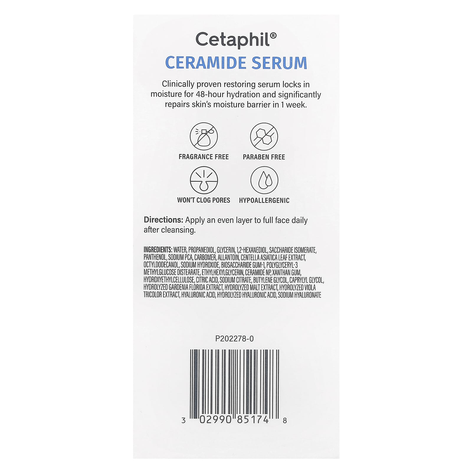 Вода, пропандиол, глицерин, 1,2-гександиол, инвертный сахар, пантенол, натрия пирролидонкарбонат, карбомер, аллантоин, экстракт листьев центеллы азиатской, октилдодеканол, гидроксид натрия, биосахаридная смола-1, полиглицерил-3 метилглюкозы дистеарат, этилгексилглицерин, керамид NP, ксантановая камедь, гидроксиэтилцеллюлоза, лимонная кислота, цитрат натрия, бутиленгликоль, каприлилгликоль, гидролизованный экстракт гардении флоридской, гидролизованный солодовый экстракт, гидролизованный экстракт фиалки трехцветной, гиалуроновая кислота, гидролизованная гиалуроновая кислота, гиалуронат натрия.