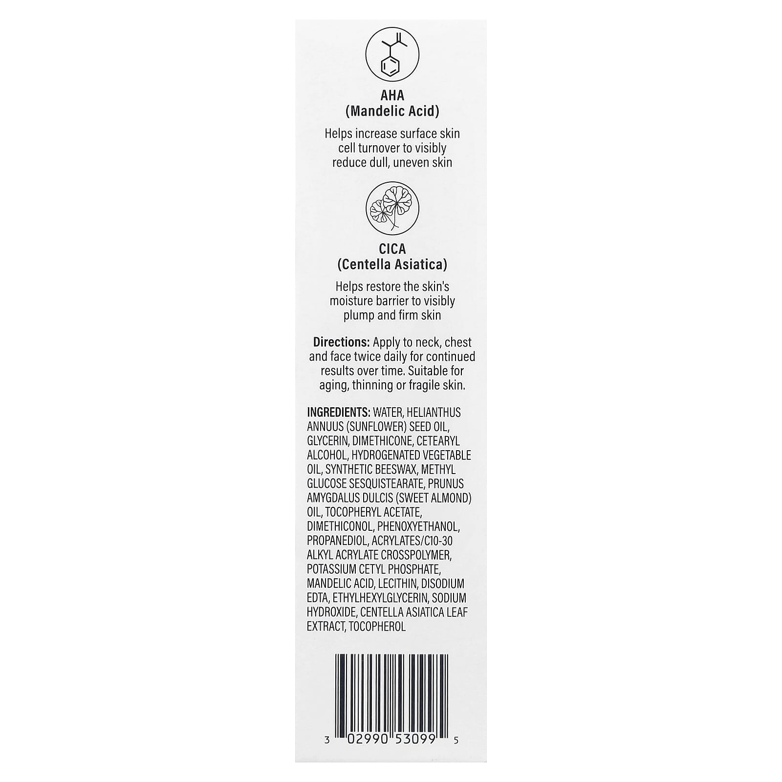 Вода, подсолнечное масло (Helianthus annuus), глицерин, диметикон, цетеариловый спирт, гидрогенизированное растительное масло, синтетический воск, метилглюкозы сесквистеарат, масло сладкого миндаля (Prunus amygdalus dulcis), токоферилацетат, диметиконол, феноксиэтанол, пропандиол, акрилат/c10-30 алкил акрилат кроссполимер, цетил фосфат калия, миндальная кислота, лецитин, двунатриевая ЭДТК, этилгексилглицерин, гидроксид натрия, экстракт листьев готу колы (Centella asiatica), токоферол.