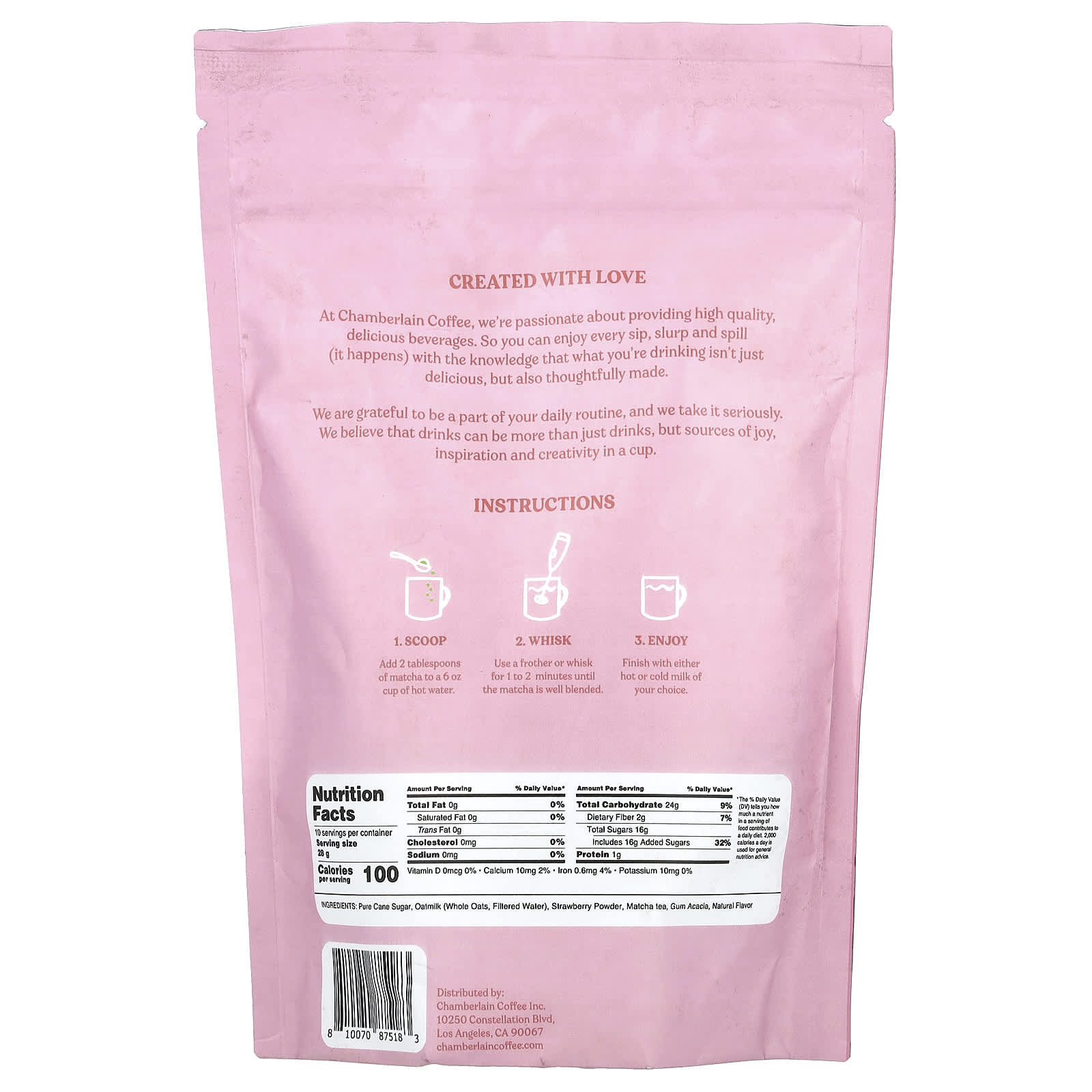 Чистый тростниковый сахар, овсяное молоко (цельный овес, фильтрованная вода), клубничный порошок, чай матча, аравийская камедь, натуральный ароматизатор.