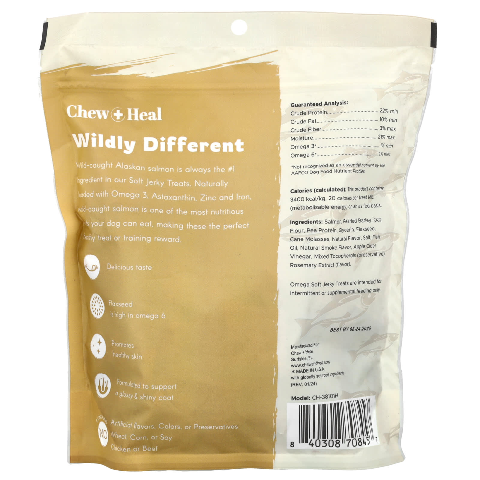 Аляскинский лосось, пойманный в дикой природе, всегда является ингредиентом № 1 в наших мягких лакомствах. Естественно содержит омега-3. Астаксантин, цинк и железо, пойманный в дикой природе лосось - одно из самых питательных лакомств, которое может съесть ваша собака, что делает его идеальным здоровым лакомством или вознаграждением за обучение.