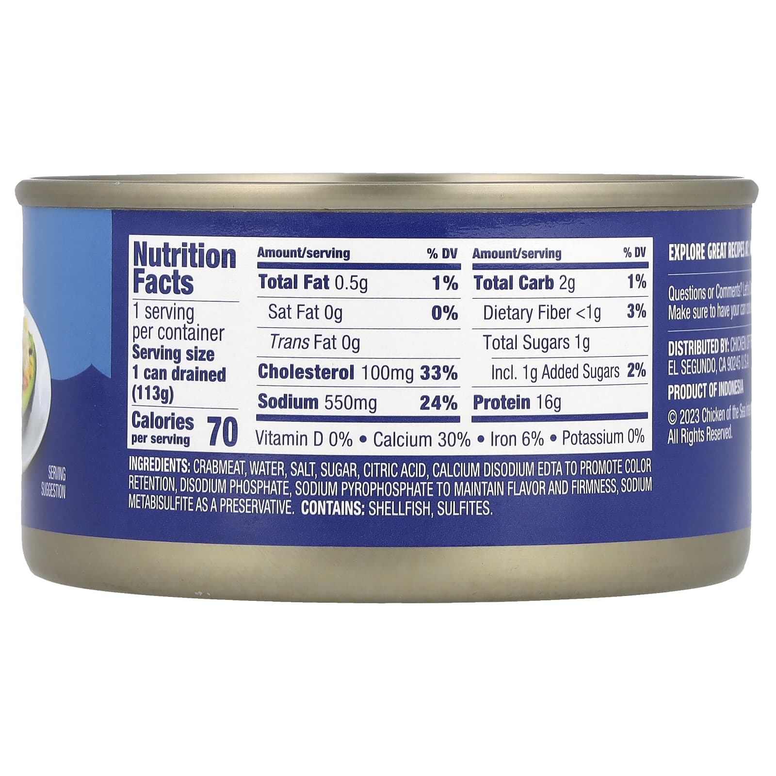 Крабовое мясо, вода, соль, сахара, лимонная кислота, динатрий кальция EDTA для сохранения цвета, динатрия фосфат, пирофосфат натрия для сохранения вкуса и упругости, метабисульфит натрия в качестве консерванта.