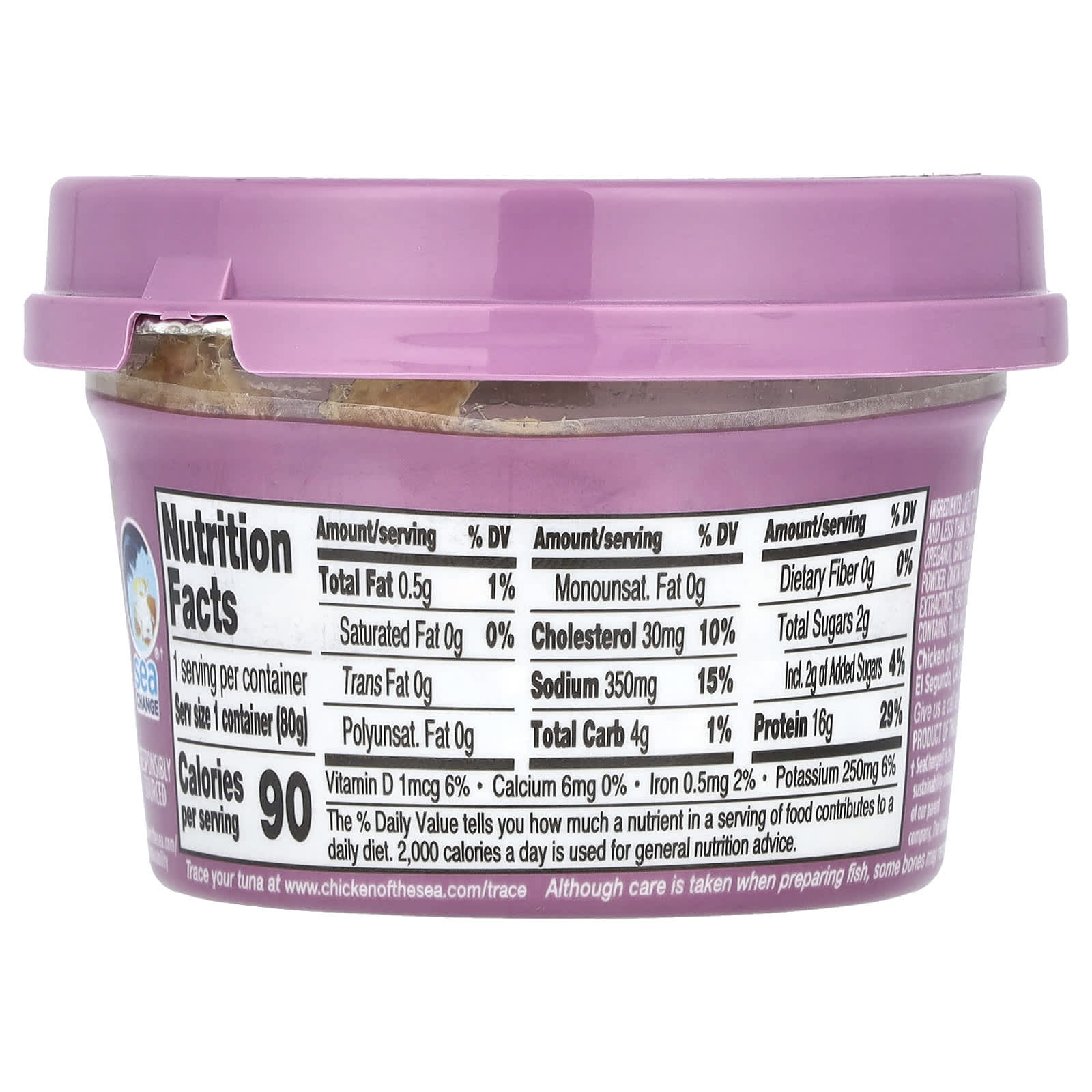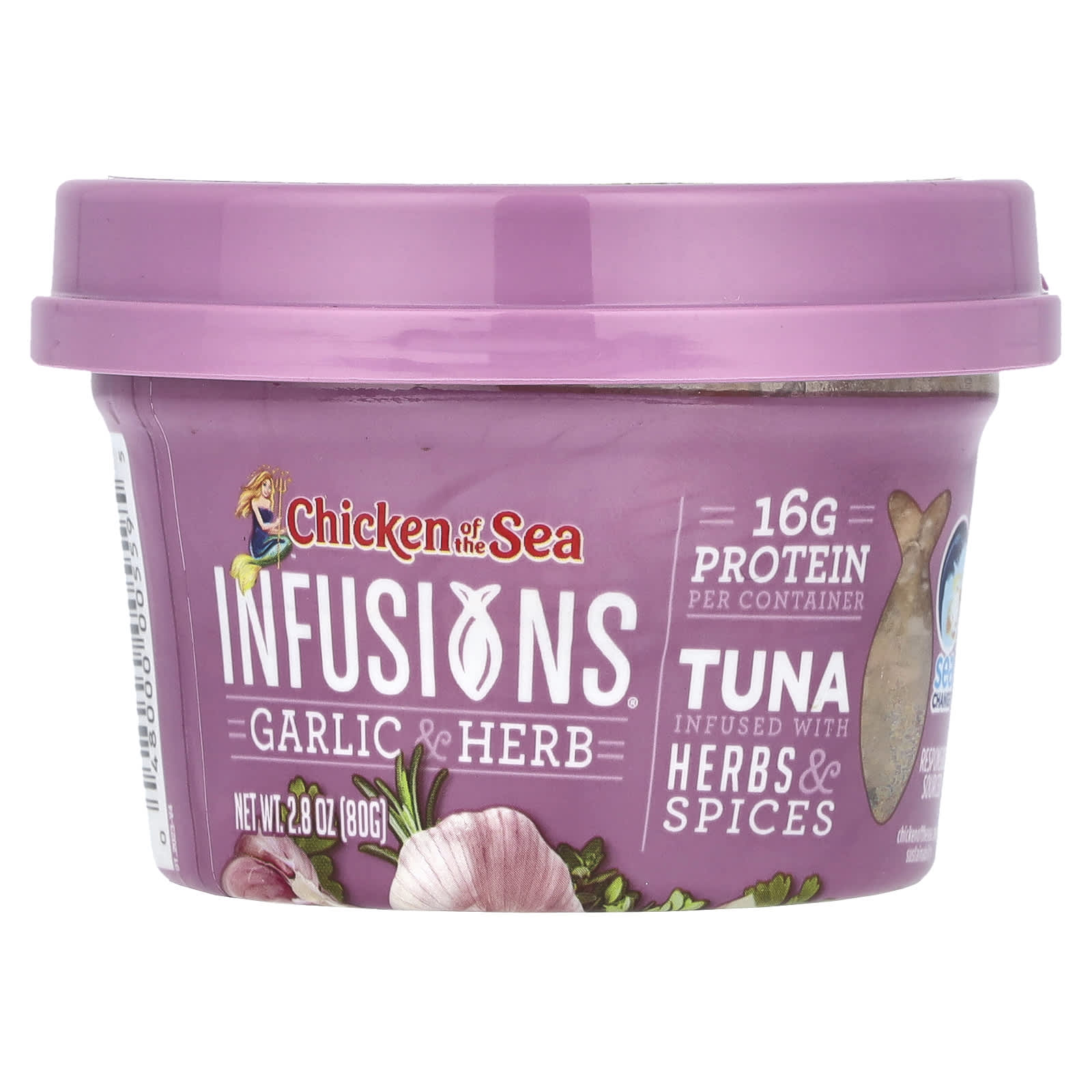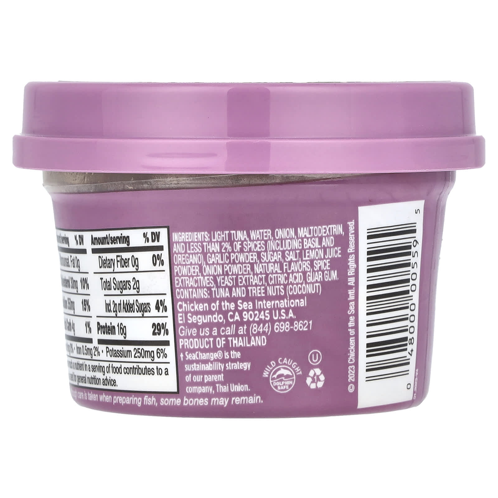 Светлый тунец, вода, лук, мальтодекстрин и менее 2% специй (включая базилик и орегано), чесночный порошок, сахара, соль, порошок из сока лимона, луковый порошок, натуральные ароматизаторы, экстракты специй, экстракт дрожжей, лимонная кислота, гуаровая камедь.