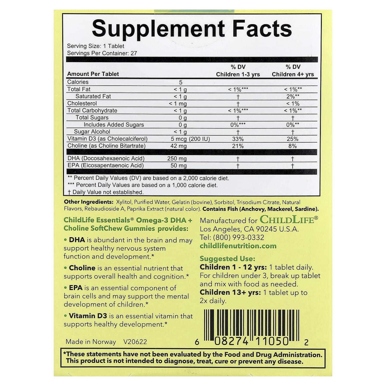 Состав омега-3 с ДГК и холином в виде жевательных таблеток SoftChew Gummies от ChildLife® Essentials: