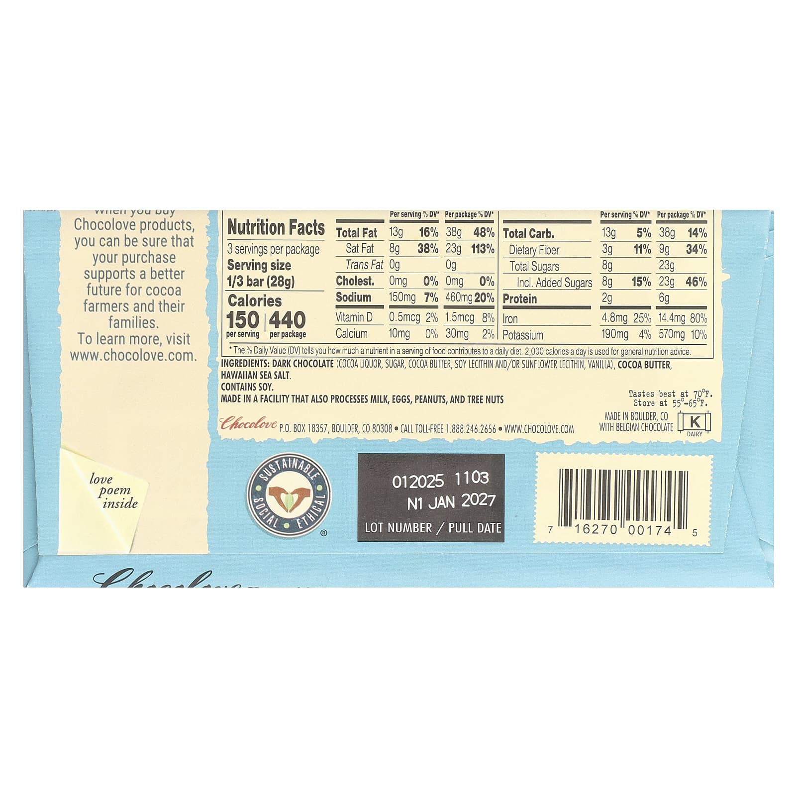Темный шоколад (тертое какао, сахара, какао-масло, лецитин из сои и/или подсолнечника, ваниль), какао-масло, Гавайская морская соль.