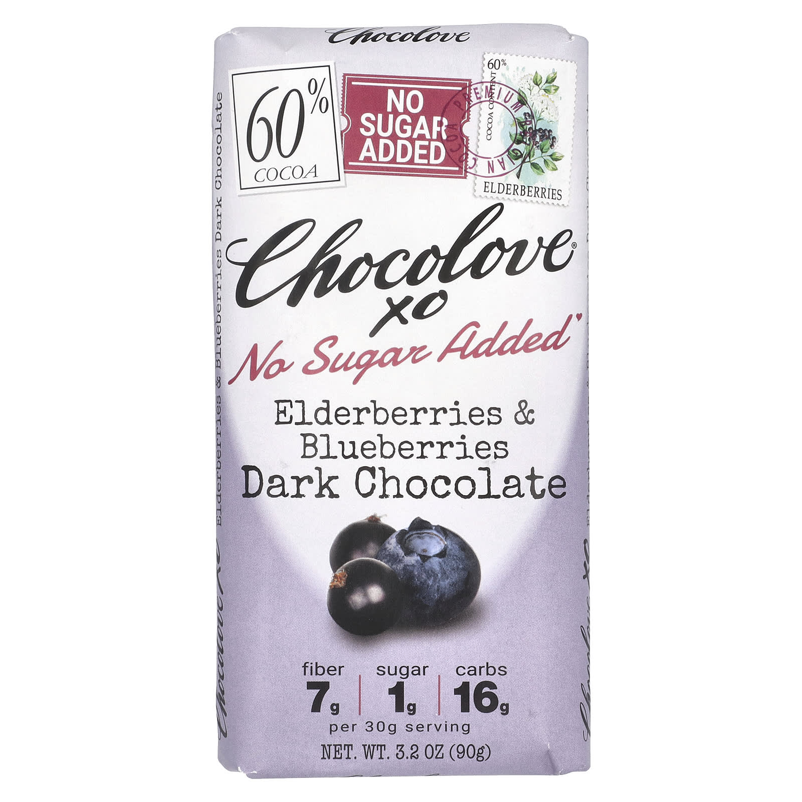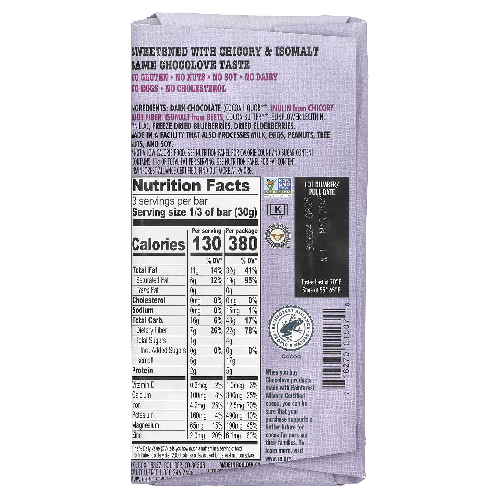 Темный шоколад (тертое какао**, инулин из клетчатки корня цикория, изомальт из свеклы, какао-масло**, подсолнечный лецитин, ваниль), сублимированная голубика, сушеная бузина.