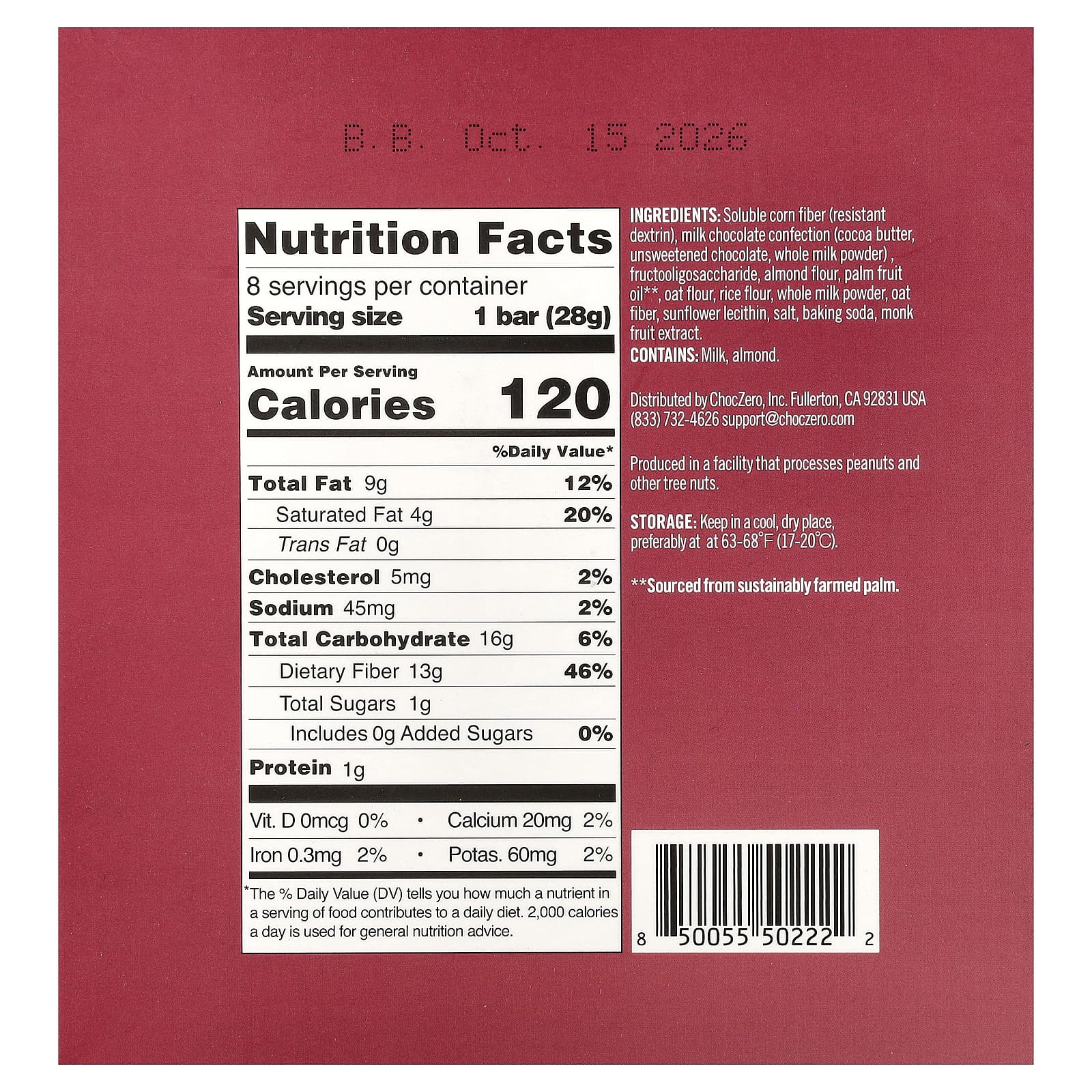 Растворимая кукурузная клетчатка (резистентный декстрин), кондитерское средство из молочного шоколада (какао-масло, горький шоколад, сухое цельное молоко), фруктоолигосахарид, миндальная мука, пальмовое масло**, овсяная мука, рисовая мука, порошок из цельного молока, овсяная клетчатка, подсолнечный лецитин, соль, пищевая сода, экстракт архата.