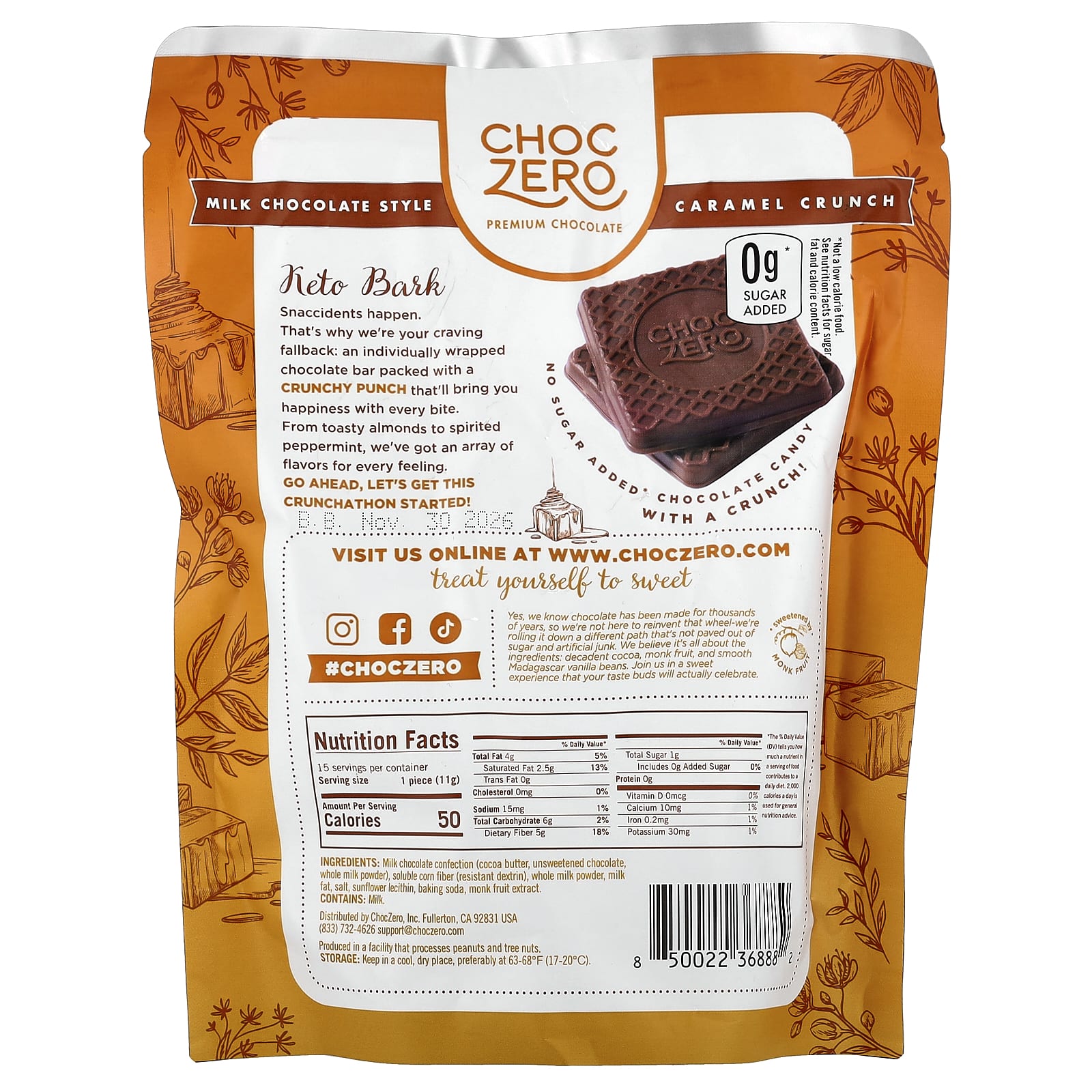 Молочный шоколад (какао-масло, несладкий шоколад, цельное сухое молоко), растворимая кукурузная клетчатка (устойчивый декстрин), сухое цельное молоко, молочный жир, соль, Лецитин подсолнечника, Пищевая сода, экстракт плодов монка.