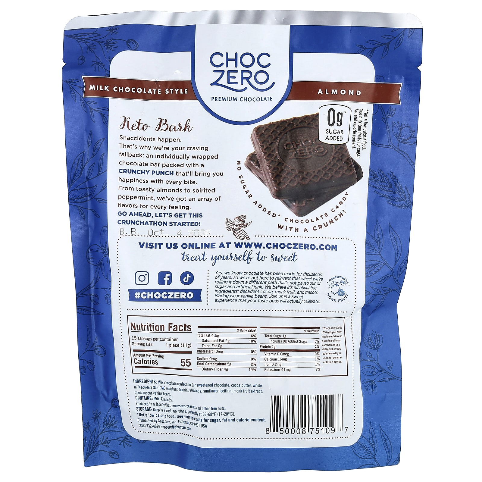 ChocZero, Keto Bark, молочный шоколад, миндаль, 15 мини-батончиков, 170 г (6 унций)