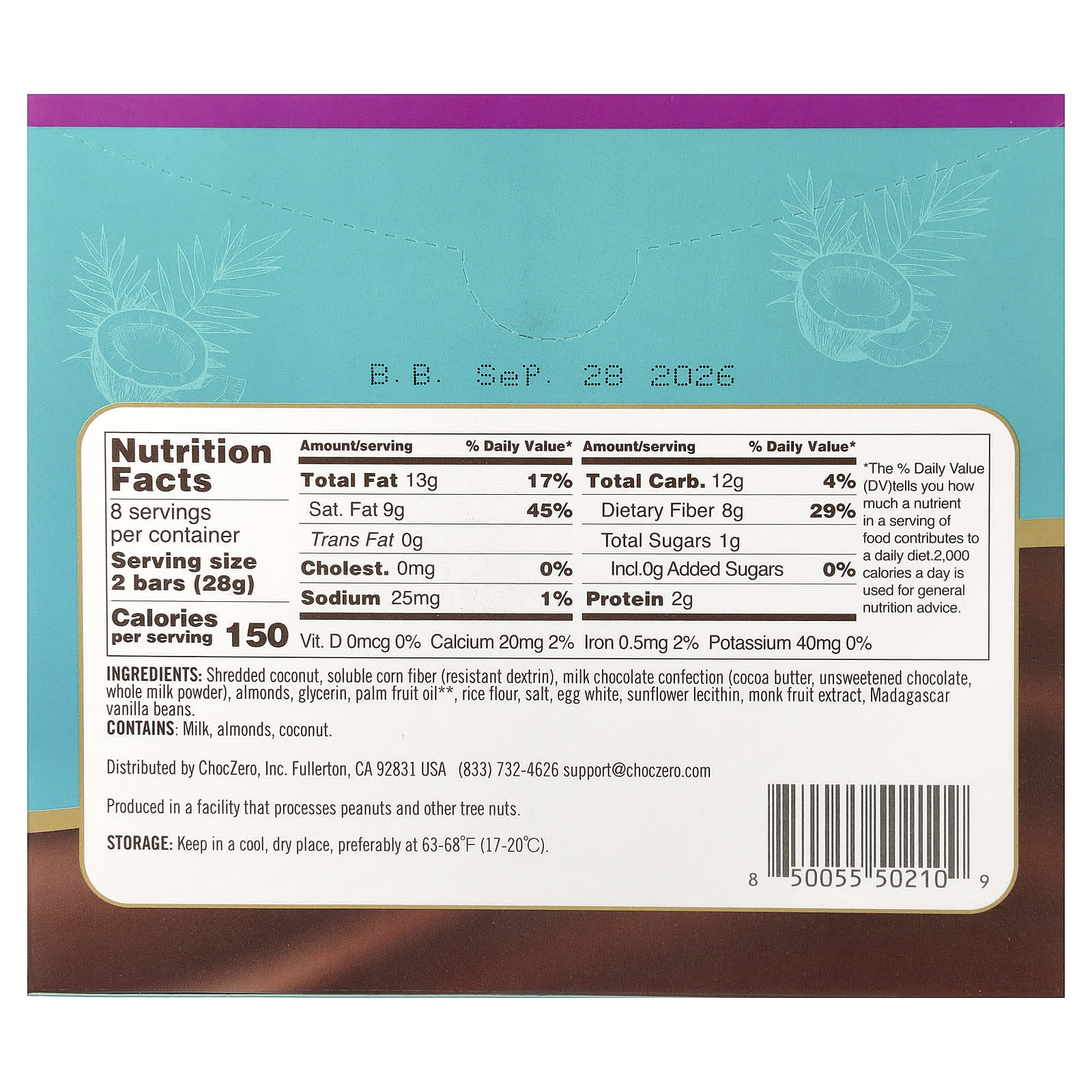 Измельченный кокос, растворимая кукурузная клетчатка (резистентный декстрин), кондитерское средство из молочного шоколада (какао-масло, горький шоколад, стручки ванили. сухое цельное молоко), миндаль, глицерин, пальмовое масло, рисовая мука, соль, яичный белок, подсолнечный лецитин, экстракт архата, Мадагаскарская ваниль.