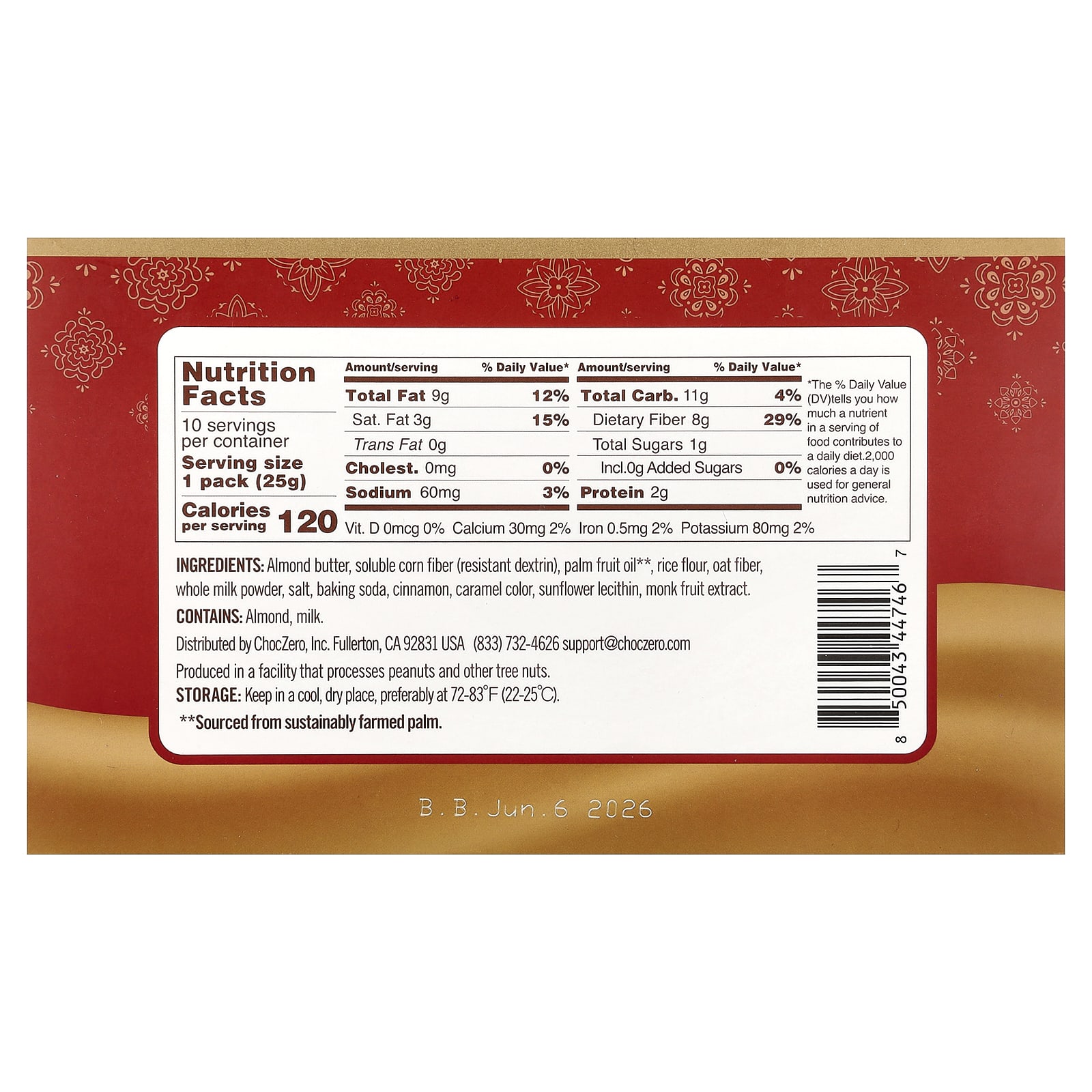 Миндальное масло, растворимая кукурузная клетчатка (стойкий декстрин), пальмовое масло **, рисовая мука, овсяная клетчатка, сухое цельное молоко, соль, пищевая сода, корица, краситель «Карамель», подсолнечный лецитин, экстракт архата.