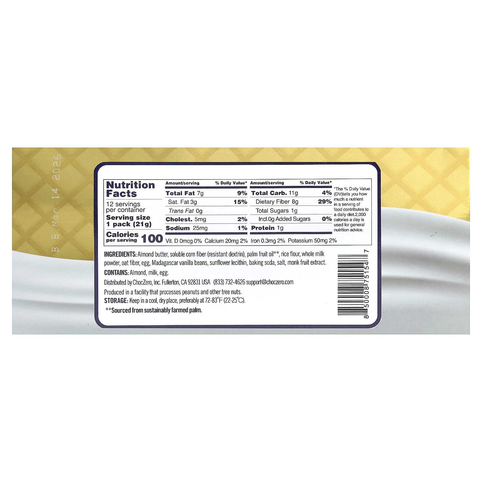 Миндальная паста, растворимая кукурузная клетчатка (резистентный декстрин), пальмовое масло**, рисовая мука, порошок из цельного молока, овсяная клетчатка, яиц, Мадагаскарская ваниль, подсолнечный лецитин, пищевая сода, соль, экстракт архата.