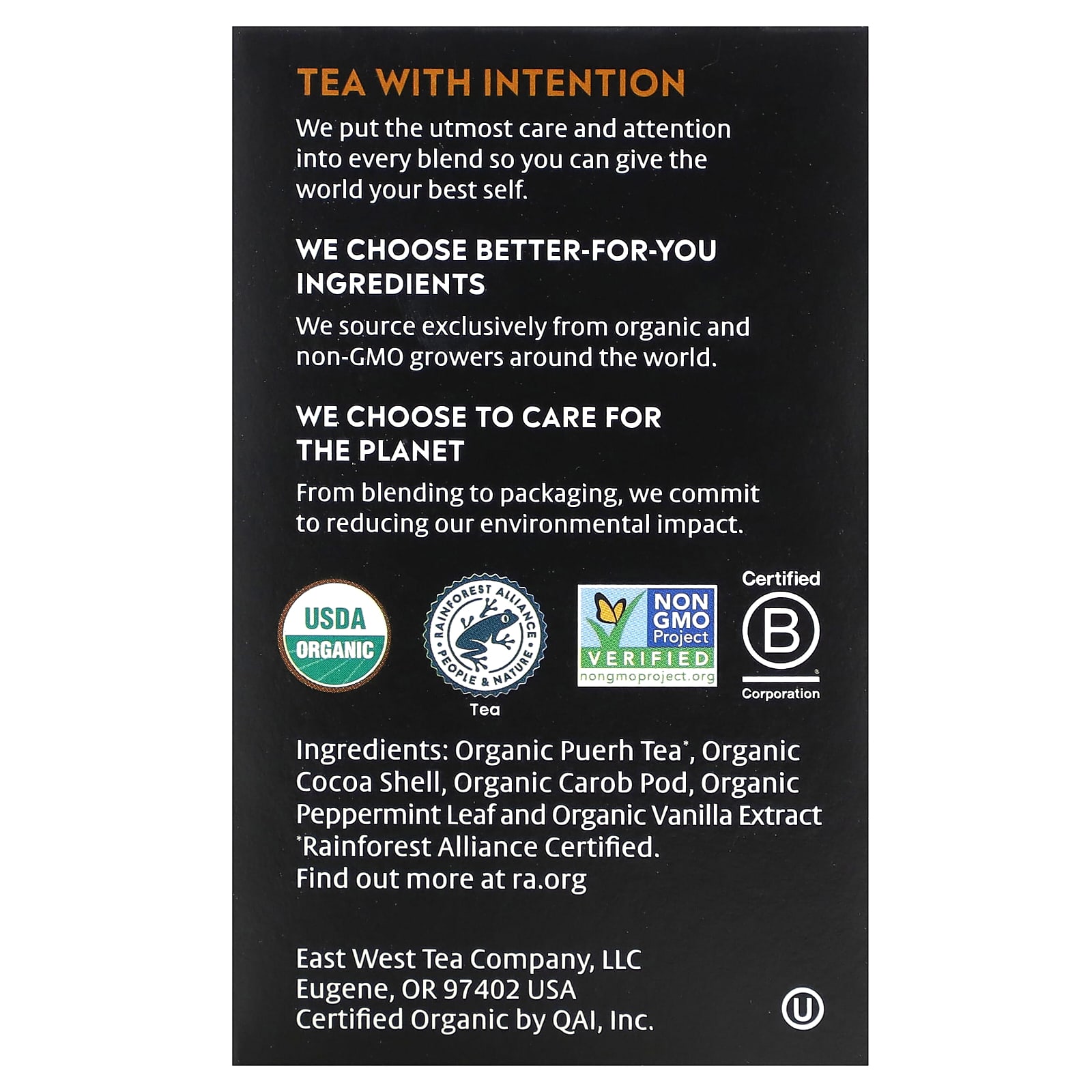 Органический чай пуэр*, органическая скорлупа какао-бобов, органические стручки рожкового дерева, листья органической мяты и экстракт органической ванили.