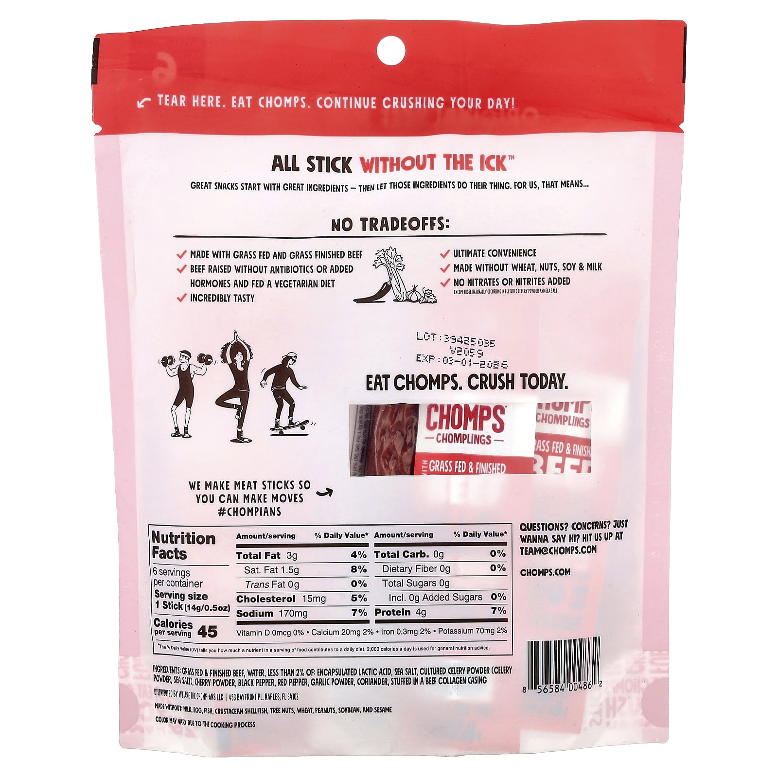 Травяной откорм и г)отовая говядина, вода, менее 2% следующих ингредиентов: инкапсулированная молочная кислота, морская соль, порошок из культивированного сельдерея (порошок из сельдерея, морская соль), порошок из вишни, черный перец, красный перец, чесночный порошок, кориандр, упакованные в говяжью коллагеновую оболочку.