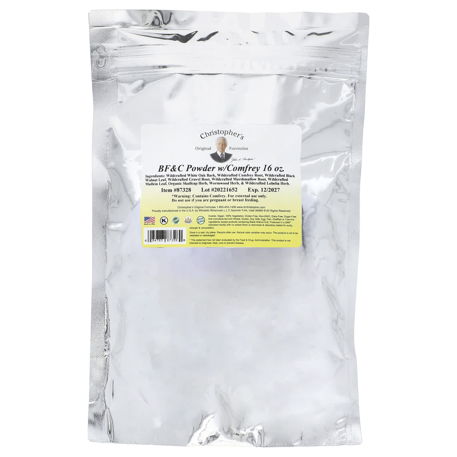 Проверенный временем порошок BF и C с окопником лекарственным от Christopher's Original Formulas поддерживает здоровье костей, кожи, тканей, волос, ногтей, зубов и десен.