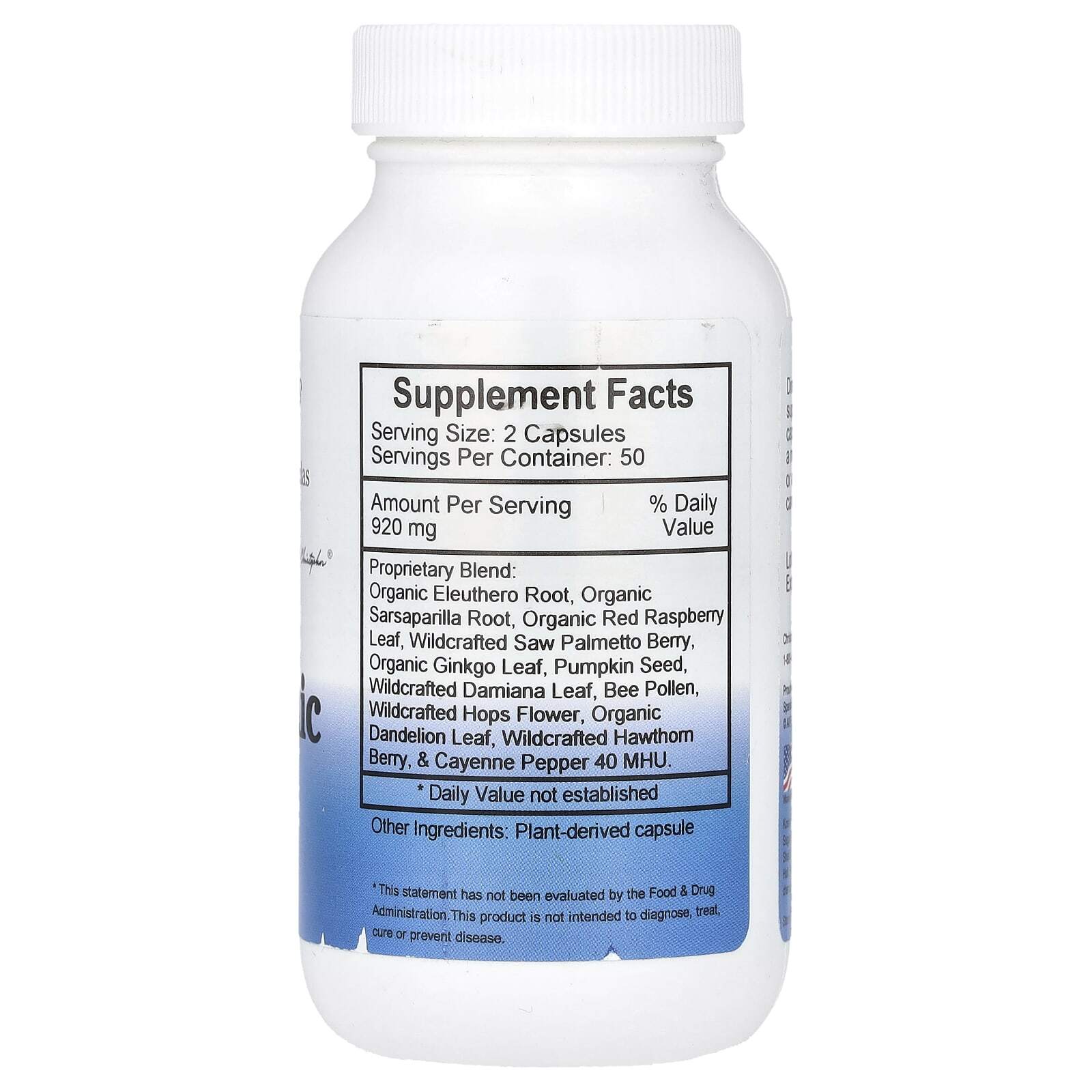 | Запатентованная смесь: Органический корень элеутерококка, органический корень сарсапариллы, органические листья красной малины, ягоды дикорастущей пальмы, листья органического гинкго, семена тыквы, листья дикорастущего дамианы, пчелиная пыльца, цветы дикорастущего хмеля, листья органического одуванчика, ягоды дикого боярышника | 920 мг | * |