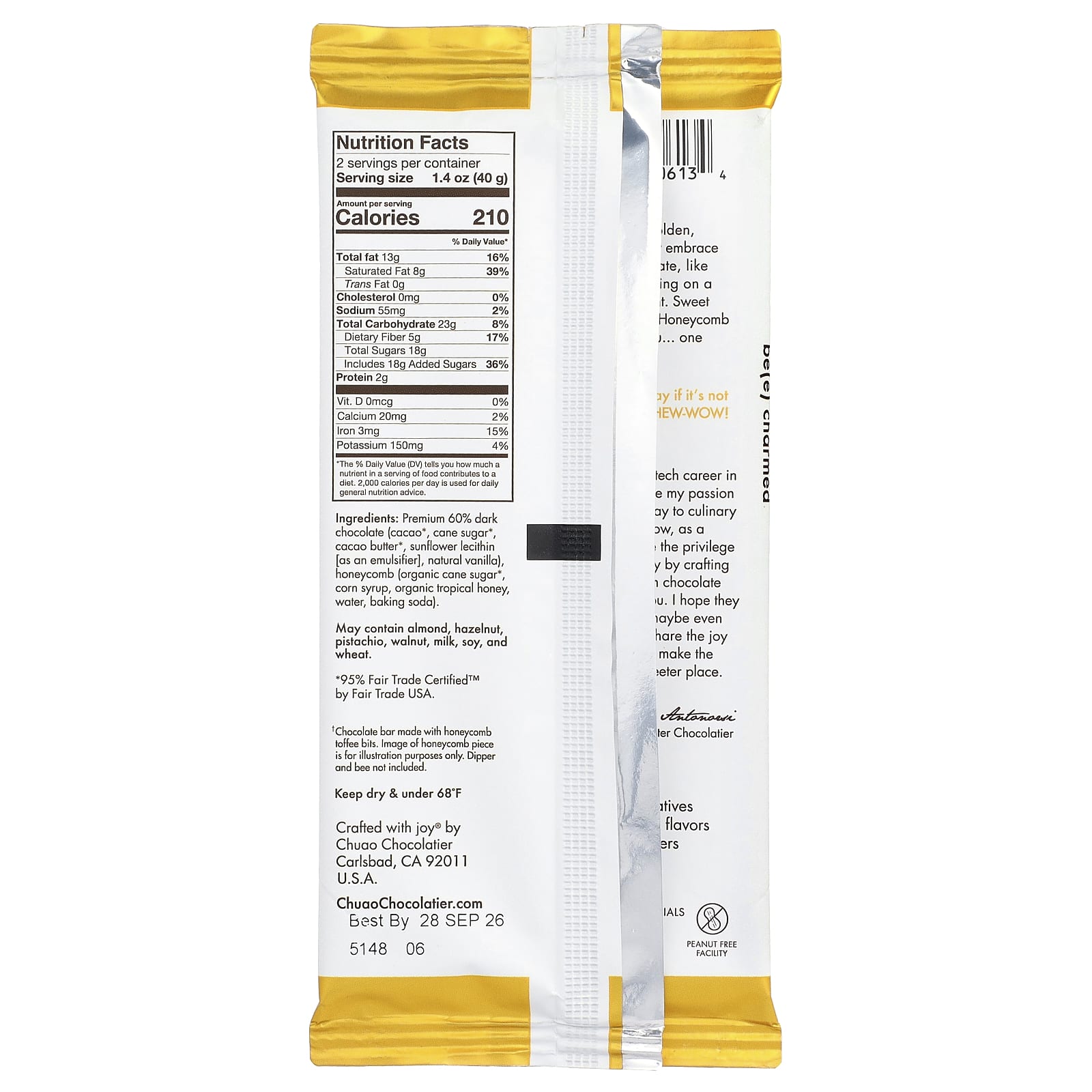 60% темный шоколад премиального качества (какао*, тростниковый сахар*, какао-масло*, подсолнечный лецитин [в качестве эмульгатора], натуральная ваниль), соты (органический тростниковый сахар*, кукурузный сироп, органический тропический мед, вода, пищевая сода).