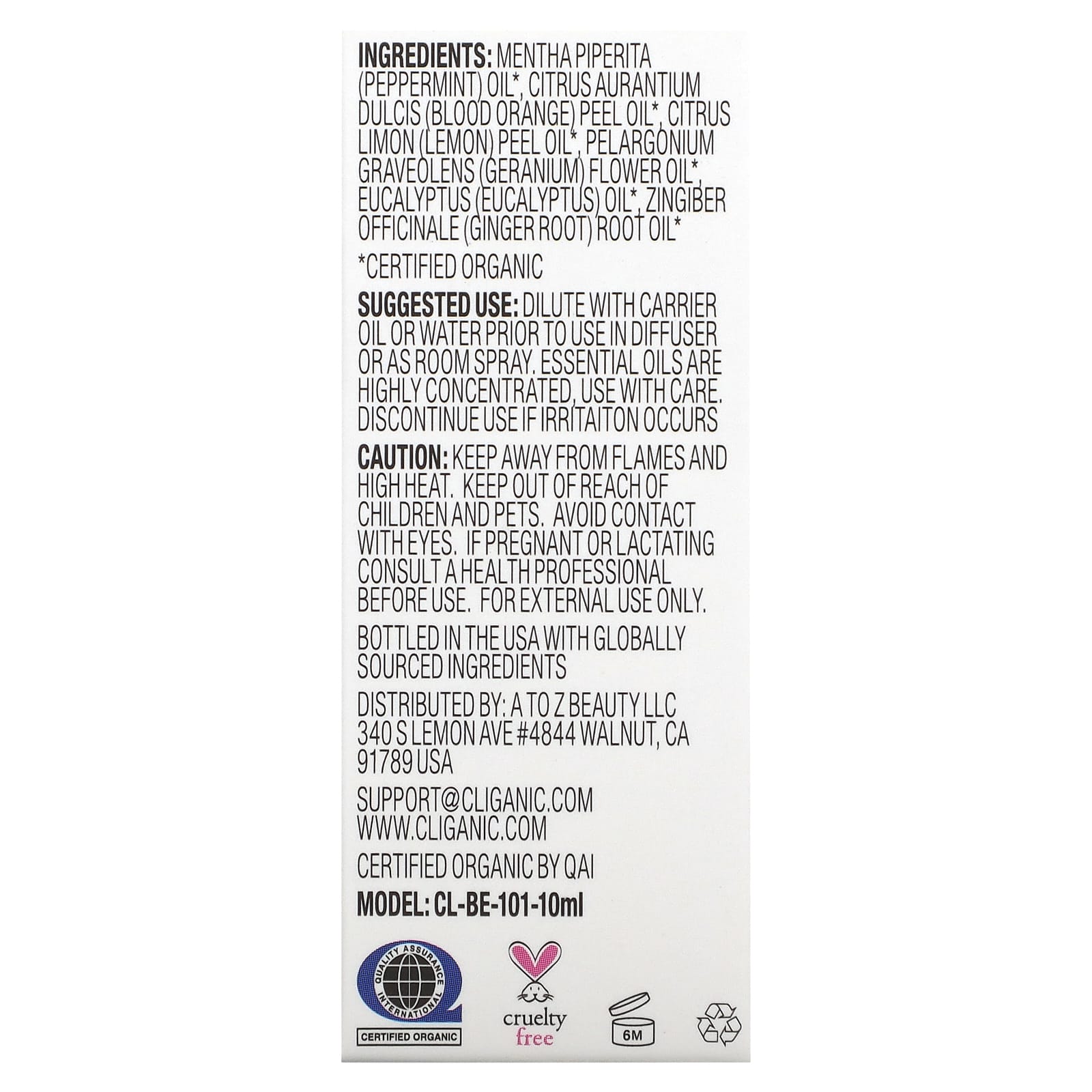 Откройте для себя бодрящий аромат Cliganic Power Up. Содержит органические эфирные масла перечной мяты, красного апельсина, лимона, герани, эвкалипта и корня имбиря. Эта запатентованная смесь пробуждает чувства мятным, ярким, травяным ароматом.