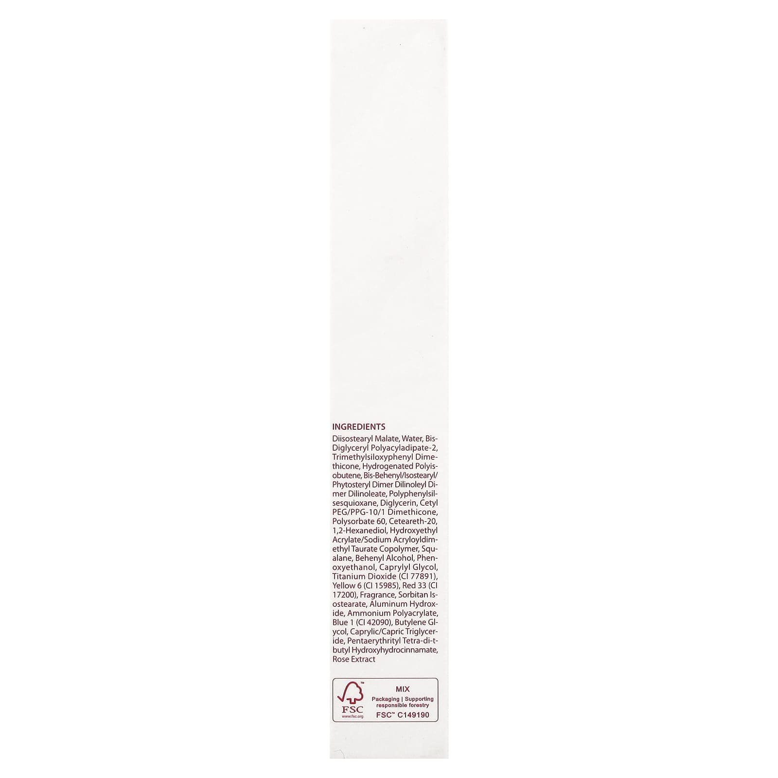 Диизостеарил малат, вода, бис-диглицерил полиациладипат-2, триметилсилоксифенил диметикон, гидрогенизированный полиизобутен, бис-бегенил / изостеарил / фитостерил димер дилинолеил димер дилинолеат, полифенилсилсесквиоксан, диглицерин, цетил ПЭГ/ППГ-10/1 диметикон, полисорбат 60, цетеарет-20,1,2-гександиол, гидроксиэтил акрилат/натрия акрилоилдиметилтаурата сополимер, сквалан, бегениловый спирт, феноксиэтанол, каприлилгликоль, диоксид титана (CI 77891), краситель желтый 6 (CI 15985), краситель красный 33 (CI 17200), отдушка, сорбитан изостеарат, гидроксид алюминия, полиакрилат аммония, краситель синий 1 (CI 42090), бутиленгликоль, каприловый/каприновый триглицерид, пентаэритритил тетра-ди-трет-бутил гидроксигидроциннамат, экстракт розы.