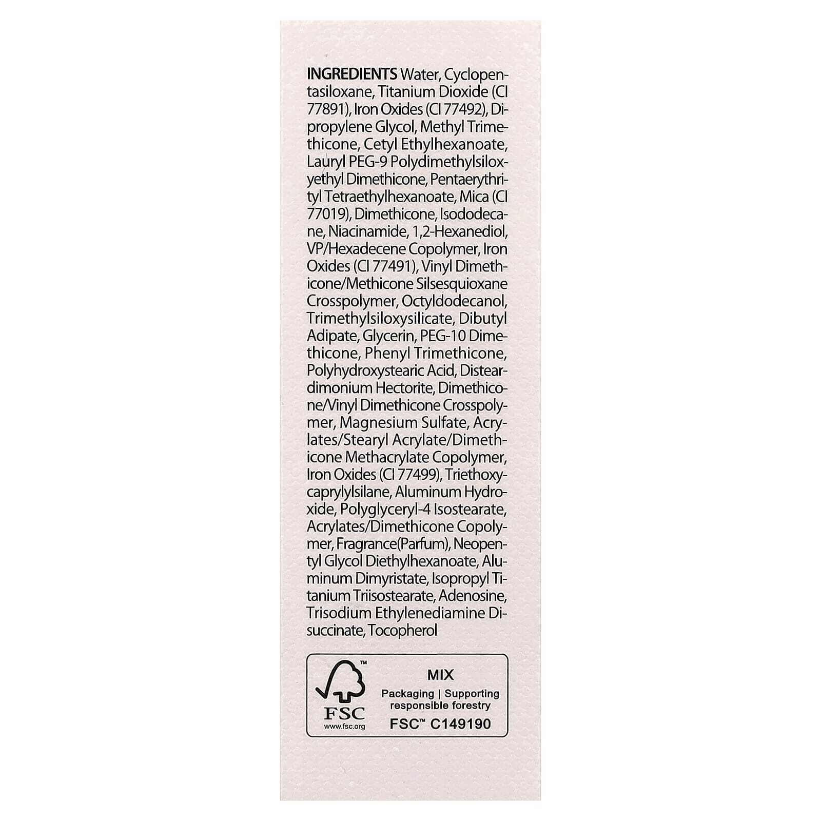 Вода, циклопентасилоксан, диоксид титана (CI 77891), оксиды железа (CI 77492), дипропиленгликоль, метилтриметикон, цетилэтилгексаноат, лаурил ПЭГ-9 полидетилсилоксиэтил диметикон, пентаэритритил тетраэтилгексаноат, слюда (CI 77019), диметикон, изододекан, никотинамид, 1,2-гександиол, ВП/гексадецен сополимер, оксиды железа (CI 77491), винил диметикон/метикон силсесквиоксан кроссполимер, октилдодеканол, триметилсилоксисиликат, дибутиладипат, глицерин, ПЭГ-10 диметикон, фенилтриметикон, полигидроксистеариновая кислота, дистеардимония гекторит, диметикон/винил диметикон кроссполимер, сульфат магния, акрилаты/стеарил акрилат/диметикон метакрилат сополимер, оксиды железа (CI 77499), триэтоксикаприлилсилан, гидроксид алюминия, полиглицерил-4 изостеарат, сополимер акрилатов / диметикона, отдушка (парфюмерная композиция), неопентилгликоль диэтилгексаноат, димиристат алюминия, изопропиловый триизостеарат титана, аденозин, тринатрия этилендиамин дисукцинат, токоферол.