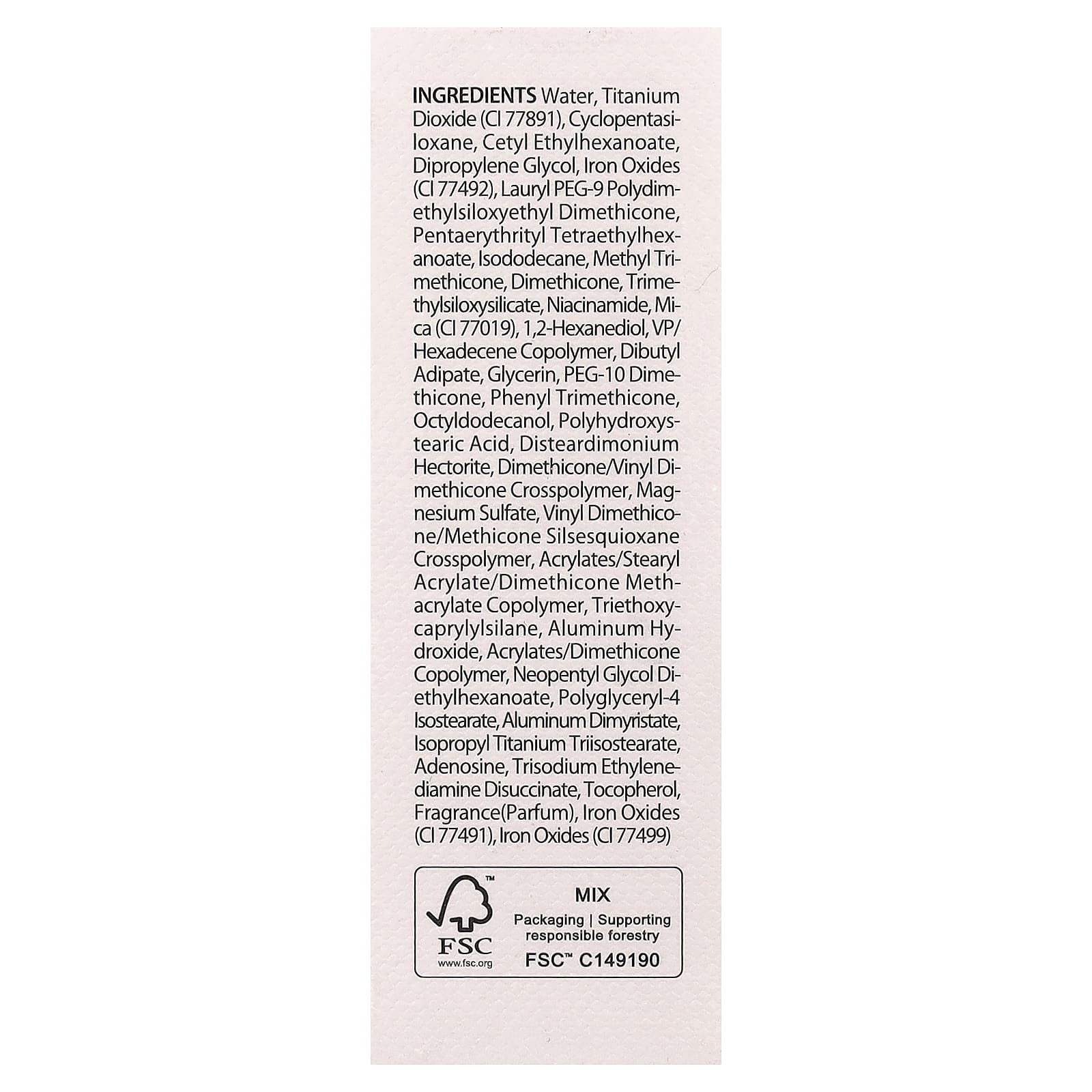 Вода, диоксид титана (CI 77891), циклопентасилоксан, цетилэтилгексаноат, дипропиленгликоль, оксиды железа (CI 77492), лаурил ПЭГ-9 полидетилсилоксиэтил диметикон, пентаэритритил тетраэтилгексаноат, изододекан, метилтриметикон, диметикон, триметилсилоксисиликат, никотинамид, слюда (CI 77019), 1,2-гександиол, ВП / гексадеценовый сополимер, дибутиладипат, глицерин, ПЭГ-10 диметикон, фенилтриметикон, октилдодеканол, полигидроксистеариновая кислота, дистеардимония гекторит, диметикон/винил диметикон кроссполимер, сульфат магния, винил диметикон/метикон силсесквиоксан кроссполимер, акрилаты/стеарил акрилат/диметикон метакрилат сополимер, триэтоксикаприлилсилан, гидроксид алюминия, сополимер акрилатов / диметикона, неопентилгликоль диэтилгексаноат, полиглицерил-4 изостеарат, димиристат алюминия, изопропиловый триизостеарат титана, аденозин, тринатрия этилендиамин дисукцинат, токоферол, отдушка (парфюмерная композиция), оксиды железа (CI 77491), оксиды железа (CI 77499).