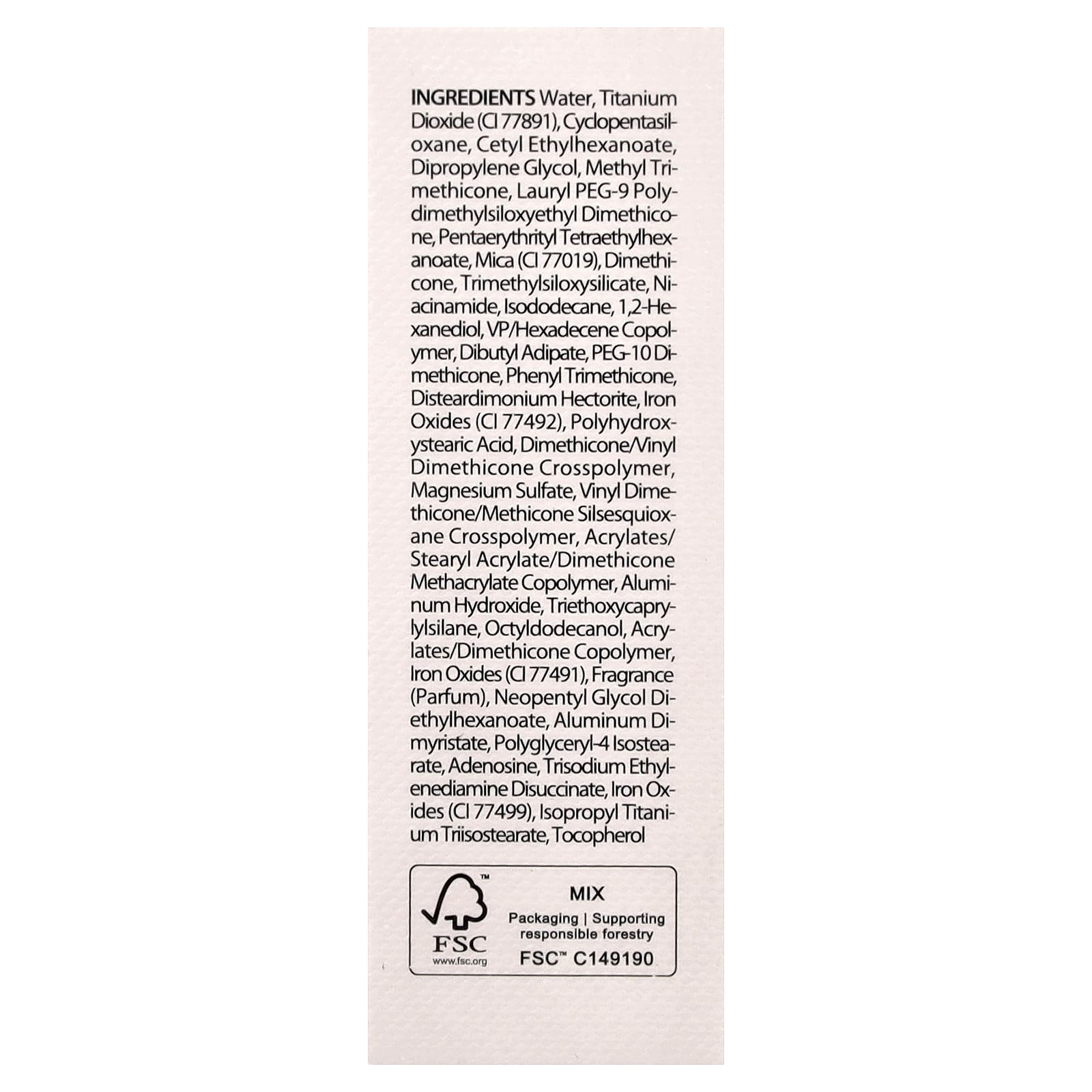 Вода, диоксид титана (CI 77891), циклопентасилоксан, цетилэтилгексаноат, дипропиленгликоль, метилтриметикон, лаурил ПЭГ-9 полидетилсилоксиэтил диметикон, пентаэритритил тетраэтилгексаноат, слюда (CI 77019), диметикон, триметилсилоксисиликат, никотинамид, изододекан, 1,2-гександиол, ВП/гексадецен сополимер, дибутиладипат, ПЭГ-10 диметикон, фенилтриметикон, дистеардимония гекторит, оксиды железа (CI 77492), полигидроксистеариновая кислота, диметикон/винил диметикон кроссполимер, сульфат магния, винил диметикон/метикон силсесквиоксан кроссполимер, сополимер акрилатов / стеарилакрилата / диметиконметакрилата, гидроксид алюминия, триэтоксикаприлилсилан, октилдодеканол, сополимер акрилатов / диметикона, оксиды железа (CI 77491), отдушка (парфюмерная композиция), неопентилгликоль диэтилгексаноат, димиристат алюминия, полиглицерил-4 изостеарат, аденозин, тринатрия этилендиамин дисукцинат, оксиды железа (CI 77499), изопропиловый триизостеарат титана, токоферол.