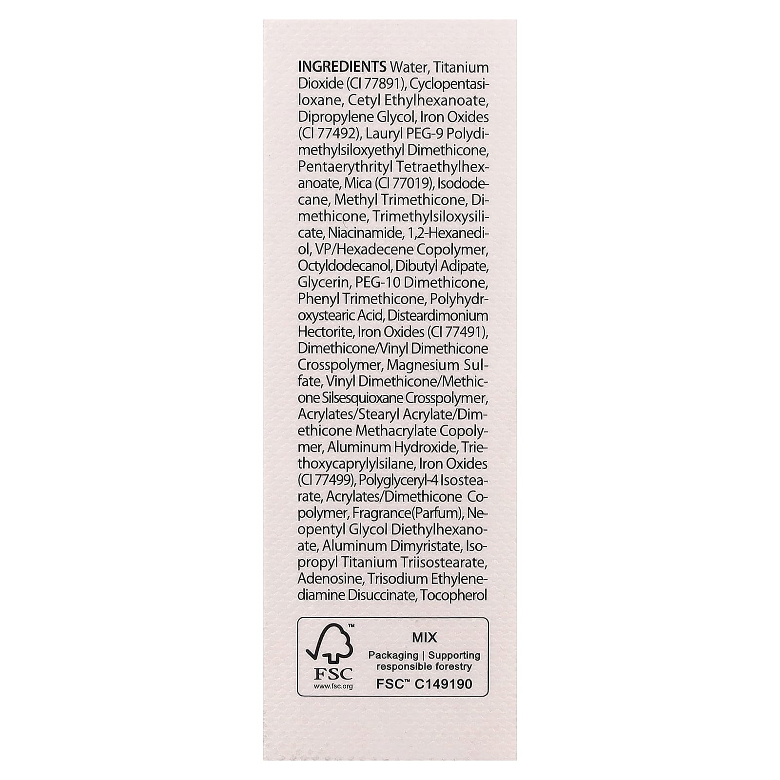 Вода, диоксид титана (CI 77891), циклопентасилоксан, цетилэтилгексаноат, дипропиленгликоль, оксиды железа (CI 77492), лаурил ПЭГ-9 полидетилсилоксиэтил диметикон, пентаэритритил тетраэтилгексаноат, слюда (CI 77019), тростник, метилтриметикон, диметикон, триметилсилоксисиликат, никотинамид, 1,2-гександиол, ВП/гексадецен сополимер, октилдодеканол, дибутиладипат, глицерин, ПЭГ-10 диметикон, фенилтриметикон, полигидроксистеариновая кислота, дистеардимония гекторит, оксиды железа (CI 77491), диметикон/винил диметикон кроссполимер, сульфат магния, винил диметикон/метикон силсесквиоксан кроссполимер, акрилаты/стеарил акрилат/диметикон метакрилат сополимер, гидроксид алюминия, триэтоксикаприлилсилан, оксиды железа (CI 77499), полиглицерил-4 изостеарат, сополимер акрилатов / диметикона, отдушка (парфюмерная композиция), неопентилгликоль диэтилгексаноат, димиристат алюминия, изопропиловый триизостеарат титана, аденозин, тринатрия этилендиамин дисукцинат, токоферол.