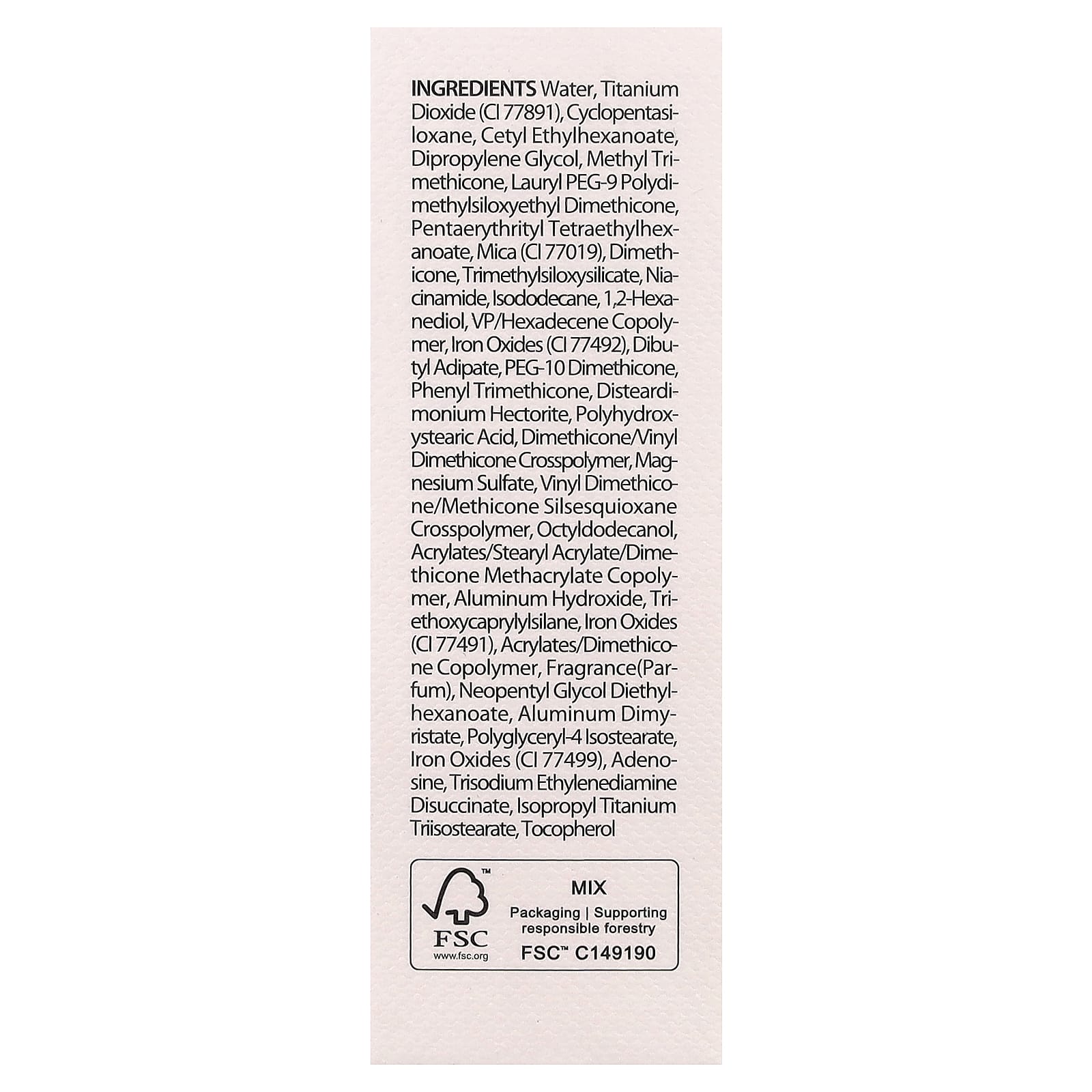 Вода, диоксид титана (CI 77891), циклопентасилоксан, цетилэтилгексаноат, дипропиленгликоль, метилтриметикон, лаурил ПЭГ-9 полидетилсилоксиэтил диметикон, пентаэритритил тетраэтилгексаноат, слюда (CI 77019), диметикон, триметилсилоксисиликат, никотинамид, изододекан, 1,2-гександиол, ВП/гексадецен сополимер, оксиды железа (CI 77492), дибутиладипат, ПЭГ-10 диметикон, фенилтриметикон, дистеардимония гекторит, полигидроксистеариновая кислота, диметикон/винил диметикон кроссполимер, сульфат магния, винил диметикон/метикон силсесквиоксан кроссполимер, октилдодеканол, акрилаты/стеарил акрилат/диметикон метакрилат сополимер, гидроксид алюминия, триэтоксикаприлилсилан, оксиды железа (CI 77491), сополимер акрилатов / диметикона, отдушка (парфюмерная композиция), неопентилгликоль диэтилгексаноат, димиристат алюминия, полиглицерил-4 изостеарат, оксиды железа (CI 77499), аденозин, тринатрия этилендиамин дисукцинат, изопропиловый триизостеарат титана, токоферол.
