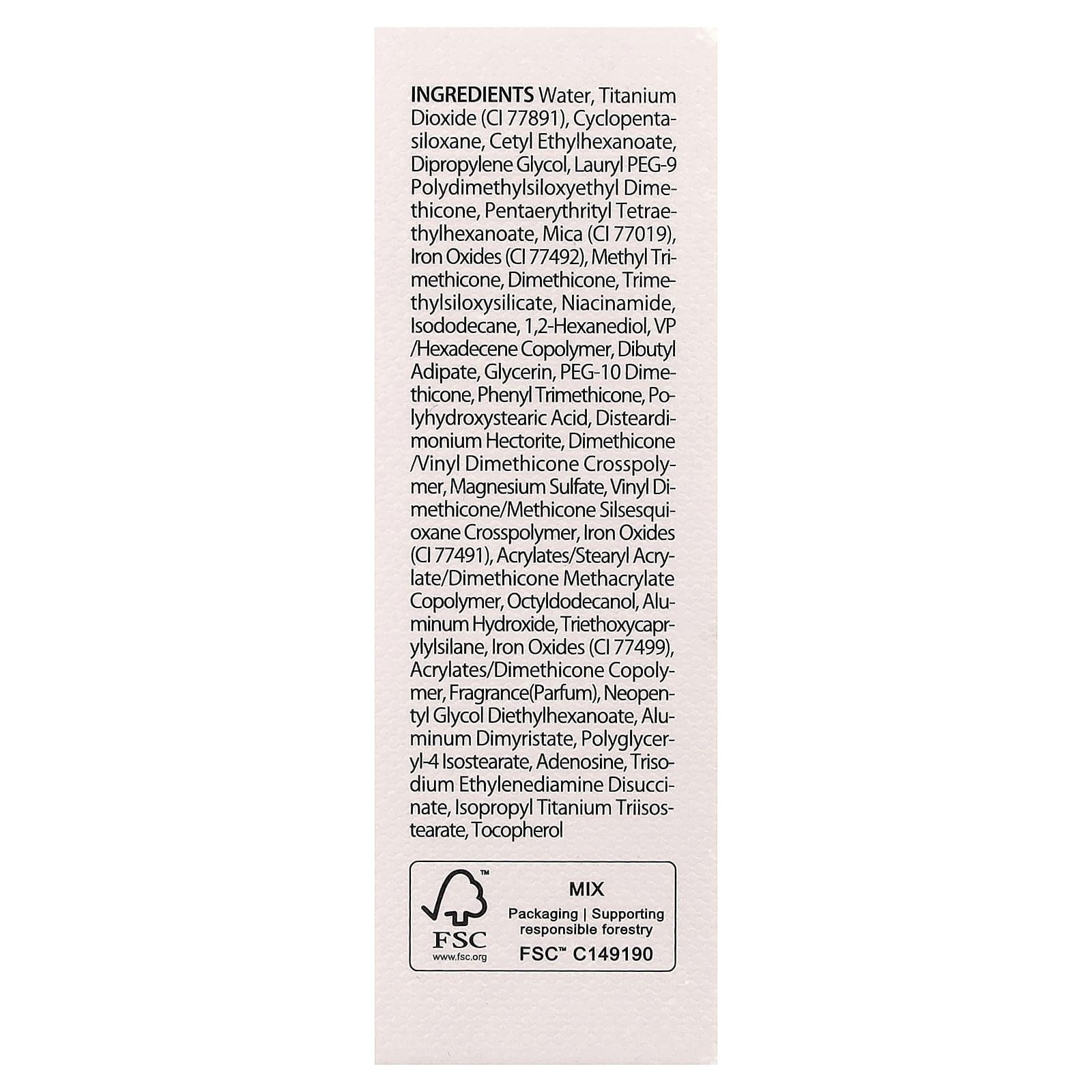 Вода, диоксид титана (CI 77891), циклопентасилоксан, цетилэтилгексаноат, дипропиленгликоль, лаурил ПЭГ-9 полидетилсилоксиэтил диметикон, пентаэритритил тетраэтилгексаноат, слюда (CI 77019), оксиды железа (CI 77492), метилтриметикон, диметикон, триметилсилоксисиликат, никотинамид, изододекан, 1,2-гександиол, ВП / гексадеценовый сополимер, дибутиладипат, глицерин, ПЭГ-10 диметикон, фенилтриметикон, полигидроксистеариновая кислота, дистеардимония гекторит, диметикон / винилдиметикон кроссполимер, сульфат магния, винил диметикон/метикон силсесквиоксан кроссполимер, оксиды железа (CI 77491), акрилаты/стеарил акрилат/диметикон метакрилат сополимер, октилдодеканол, гидроксид алюминия, триэтоксикаприлилсилан, оксиды железа (CI 77499), сополимер акрилатов / диметикона, отдушка (парфюмерная композиция), неопентилгликоль диэтилгексаноат, димиристат алюминия, полиглицерил-4 изостеарат, аденозин, тринатрия этилендиамин дисукцинат, изопропиловый триизостеарат титана, токоферол.