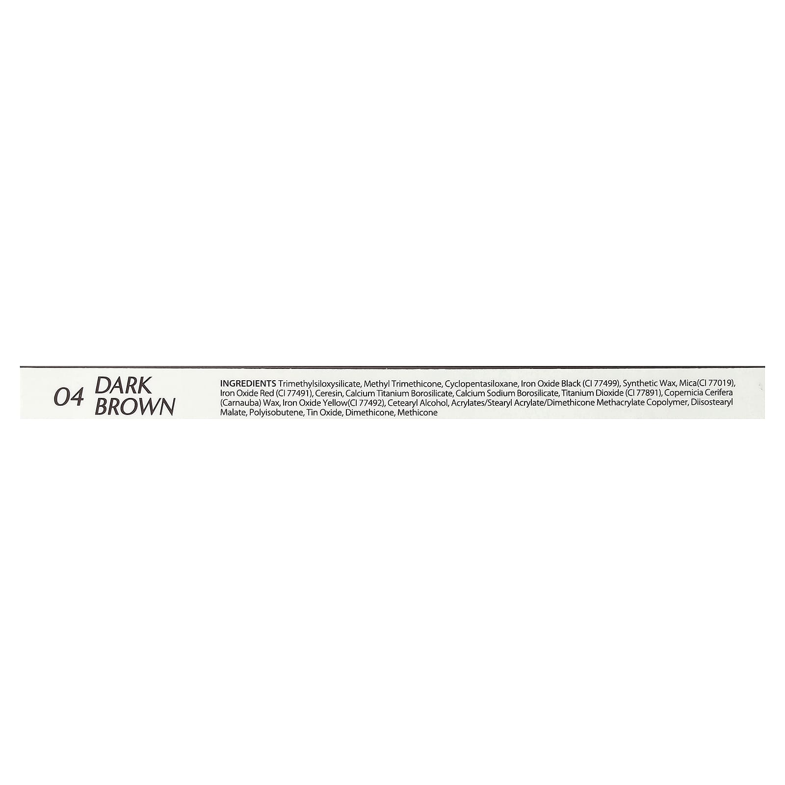 Триметилсилоксисиликат, метилтриметикон, циклопентасилоксан, оксид железа чёрный (CI 77499), синтетический воск, слюда (CI 77019), оксид железа красный (CI 77491), церезин, боросиликат кальция и титана, кальций натрий боросиликат, диоксид титана (CI 77891), карнаубский воск (Copernicia cerifera), оксид железа желтый (CI 77492), цетеариловый спирт, акрилаты/стеарил акрилат/диметикон метакрилат сополимер, диизостеарил малат, полиизобутен, оксид олова, диметикон, метикон.