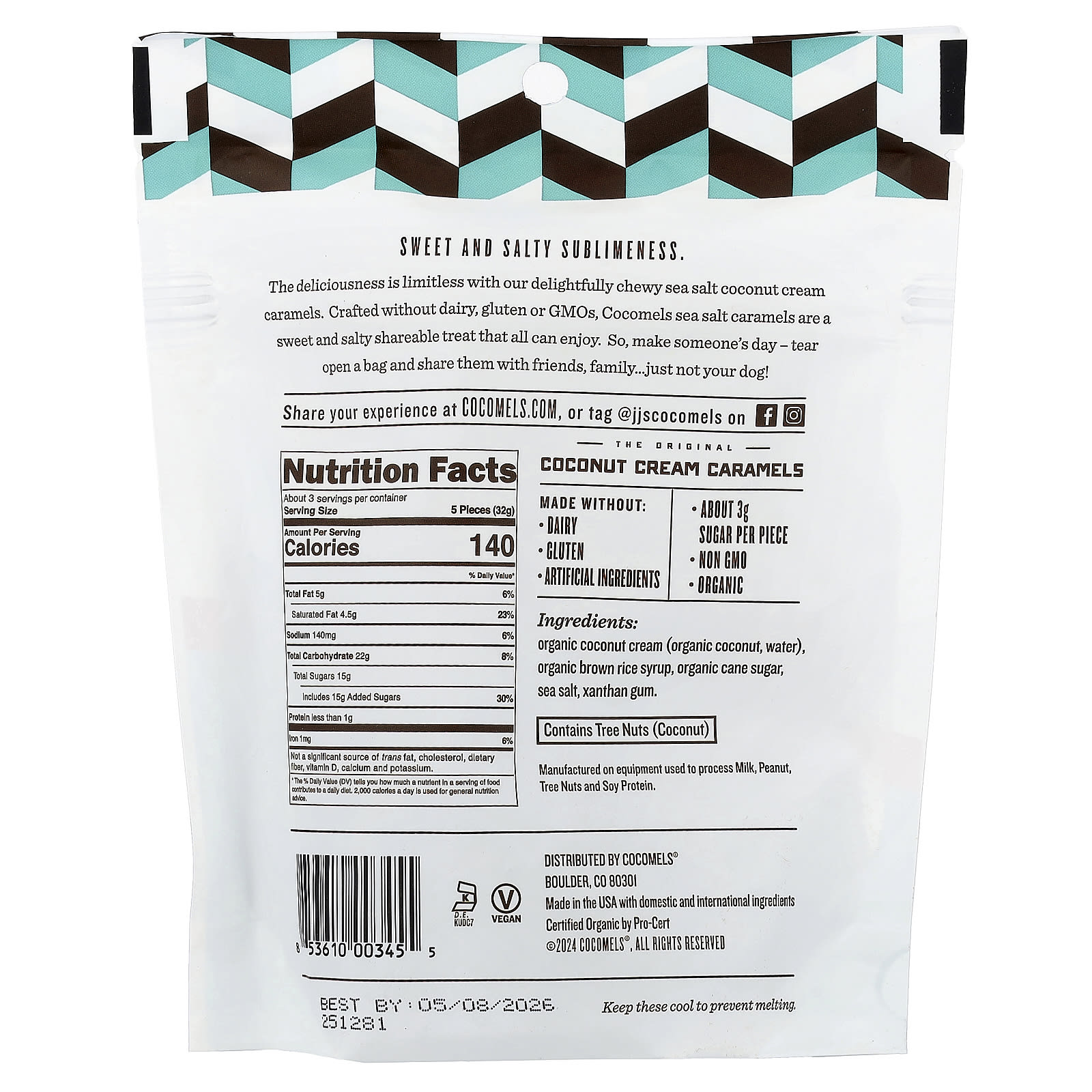 Испытайте безграничное наслаждение благодаря нашим восхитительным жевательным карамельным конфетам с морской солью и кокосовым кремом. Карамель Cocomels не содержит молочных продуктов, глютена и ГМО, это сладкое и соленое лакомство, которое легко поделиться с друзьями. Сделайте свой любимый день - откройте пакет и поделиться с друзьями, родными... только не со своей собакой!