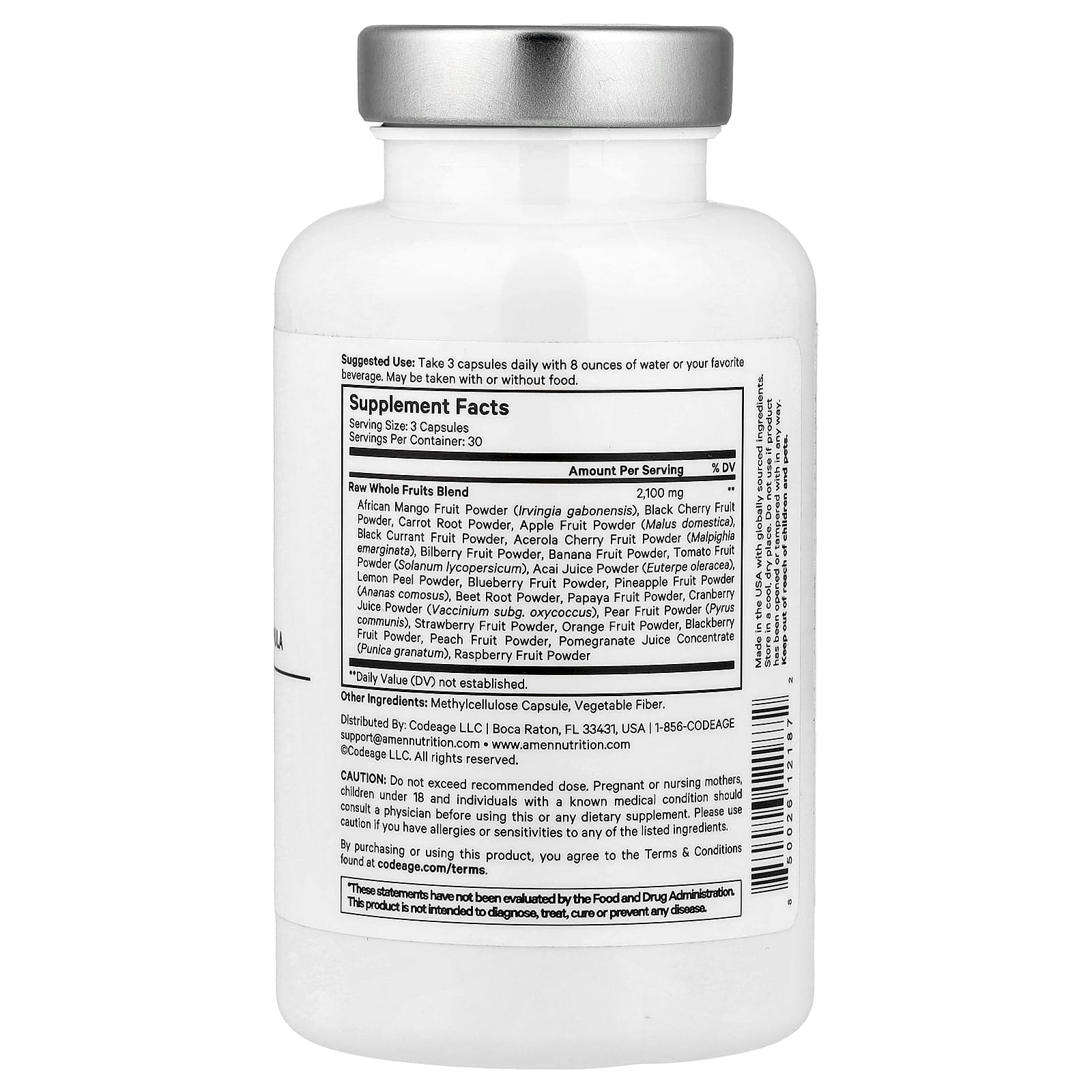 Капсулы Amen Fruits — это веганская добавка, которая содержит разнообразную смесь необработанных цельных фруктов и ягод, включая цитрусовые и тропические фрукты, семечковые, красные фрукты и темные ягоды. Этот мультивитаминный комплекс для ежедневного приема, обогащенный красными суперфудами, такими как ягоды асаи, гранатом и черной смородиной, предлагает удобный способ включить в свой рацион цельнопищевые ингредиенты.