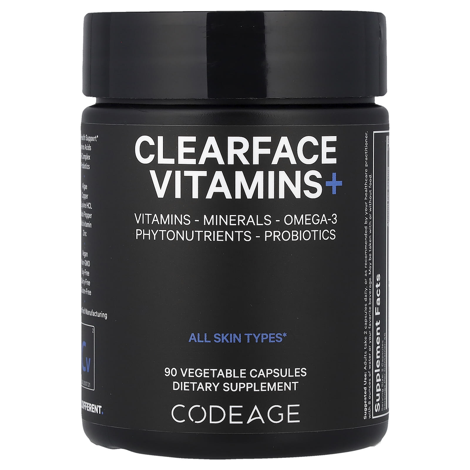 Codeage Clearface предлагает универсальную веганскую добавку из цельных продуктов с витаминами A, C, D3, E, ниацином, рибофлавином, пантотеновой кислотой, минералами, фитокерамидами, пробиотиками, омега-3, L-лизином гидрохлоридом и травяная смесь, дополняющая ваш ежедневный уход за кожей.