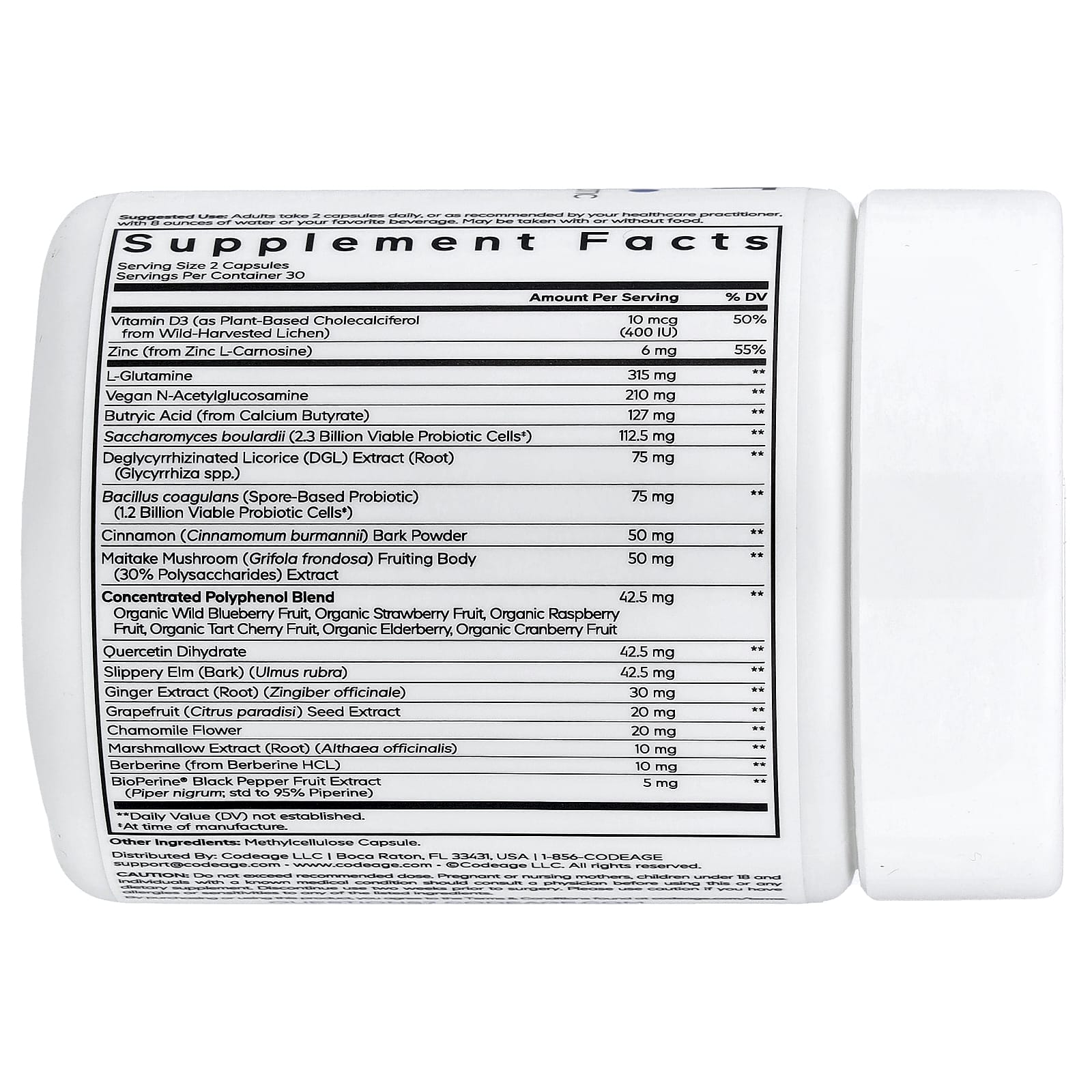 Добавка для облегчения симптомов синдрома раздражённого кишечника Codeage содержит набор ингредиентов, таких как L-глютамин и витамин D, полученные из холекальциферола, а также L-карнозин с цинком, N-ацетилглюкозамин, масляную кислоту, гидрохлорид берберина и органические полифенолы.