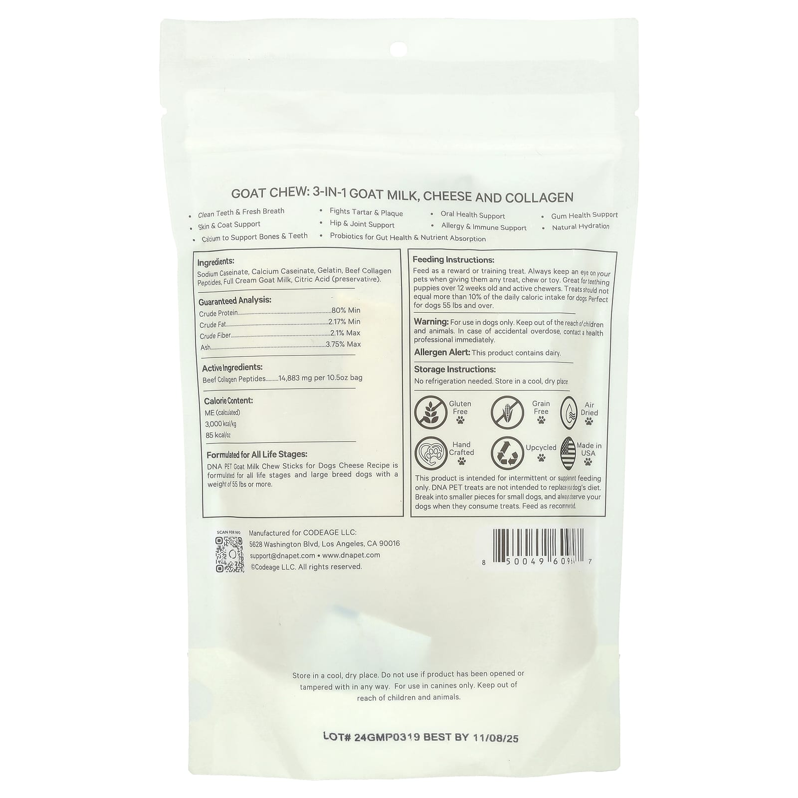 Подходит для всех этапов жизни: Рецепт жевательных палочек из козьего молока для собак от DNA PET разработан для собак на всех этапах жизни и для собак крупных пород с весом от 55 фунтов.