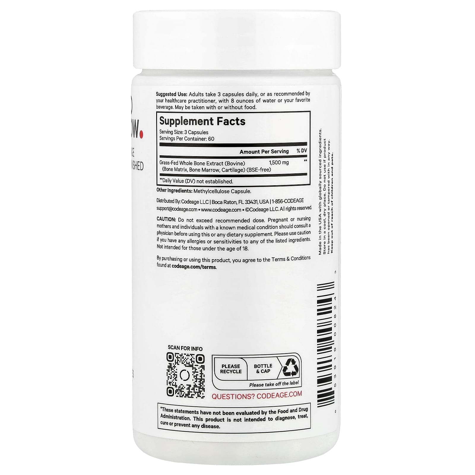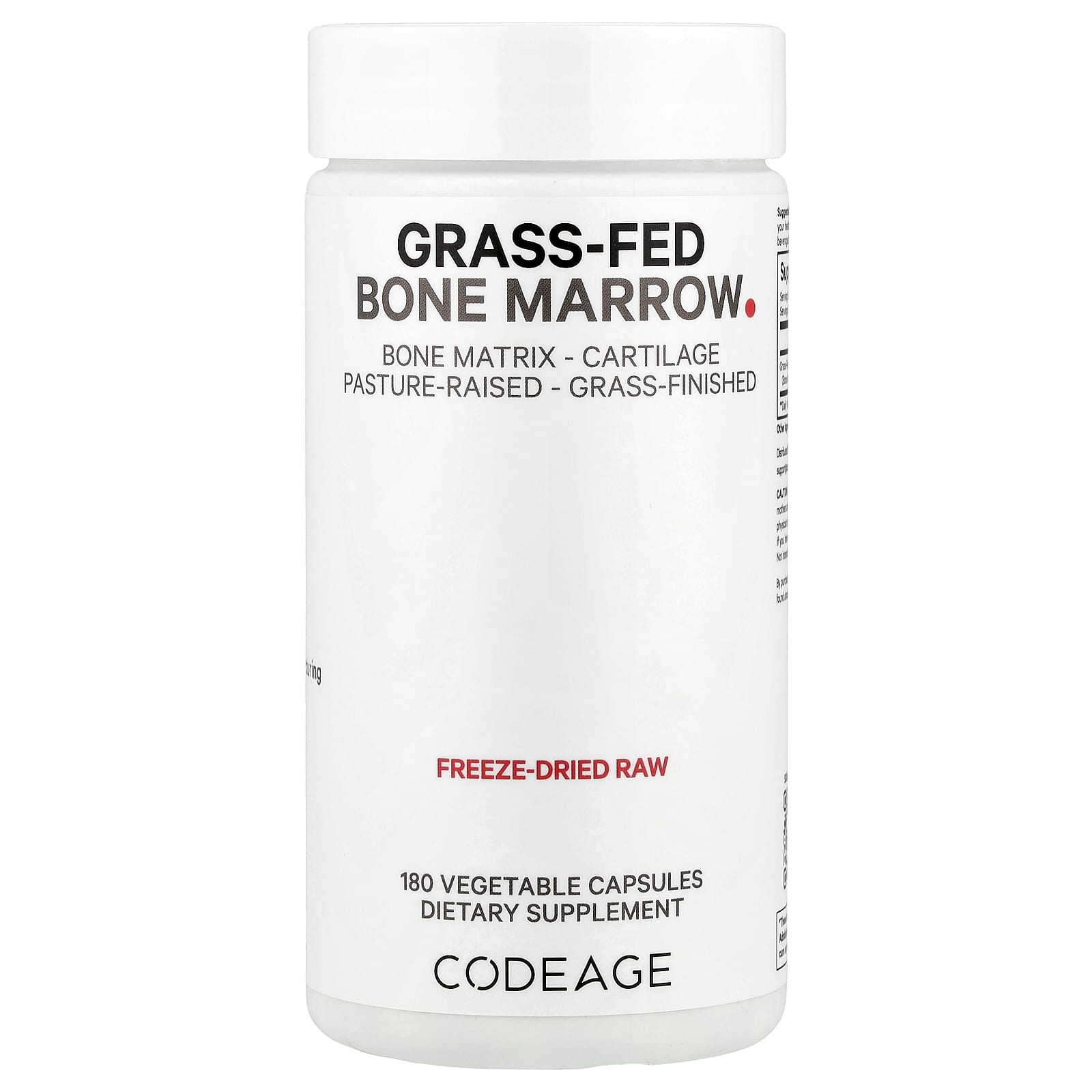 Добавка для костного мозга от животных травяного откорма Codeage содержит 1500 мг экстракта цельных костей травяного откорма, включая костный мозг, костный матрикс и хрящи на 1 порцию.
