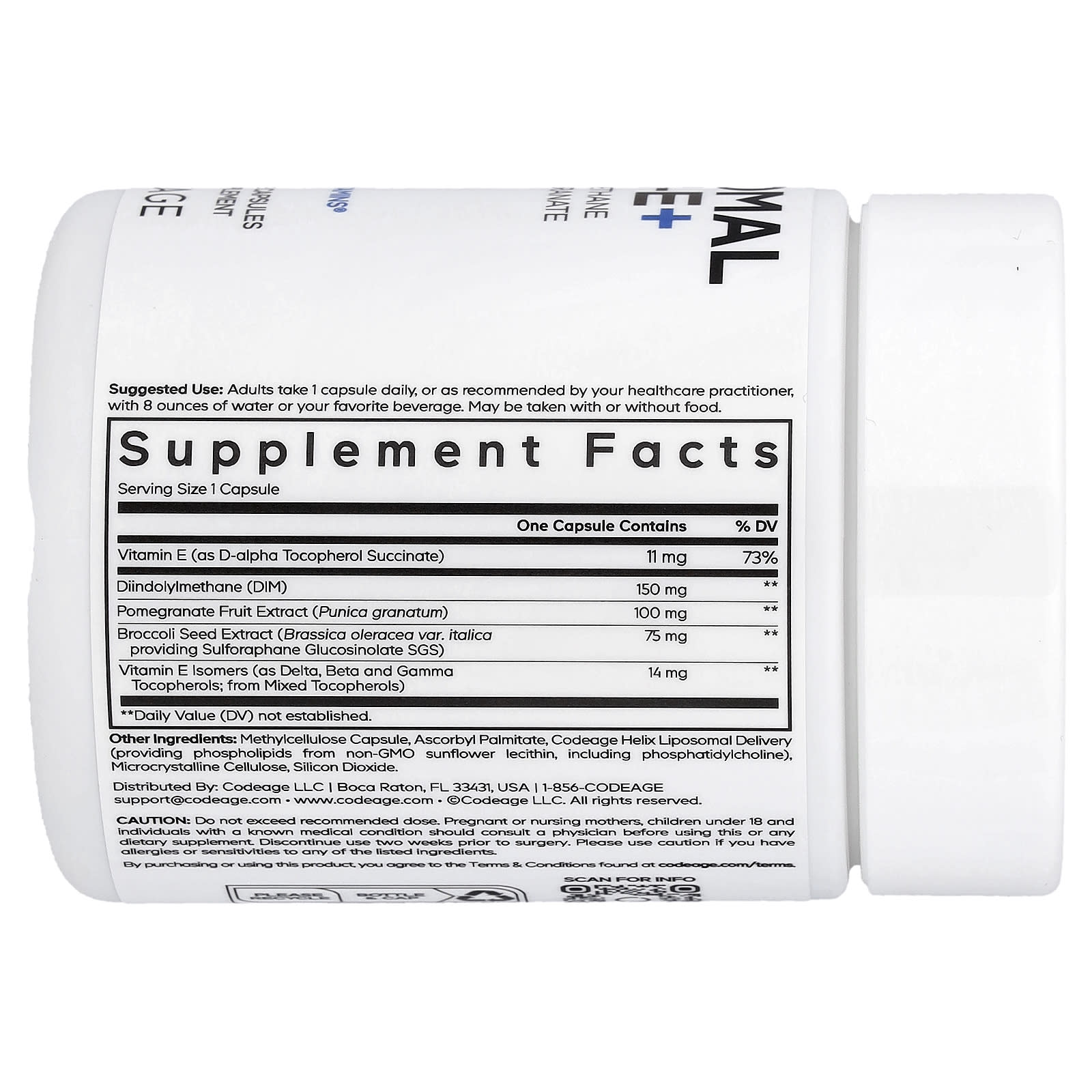 Добавка Liposomal Dim-E+ от Codeage содержит дииндолилметан (ДИМ) и смесь таких ингредиентов, как изомеры витамина E (бета-, гамма- и дельта-токоферол), витамин E (d-альфа токоферол), экстракт плодов граната и экстракт семян брокколи.