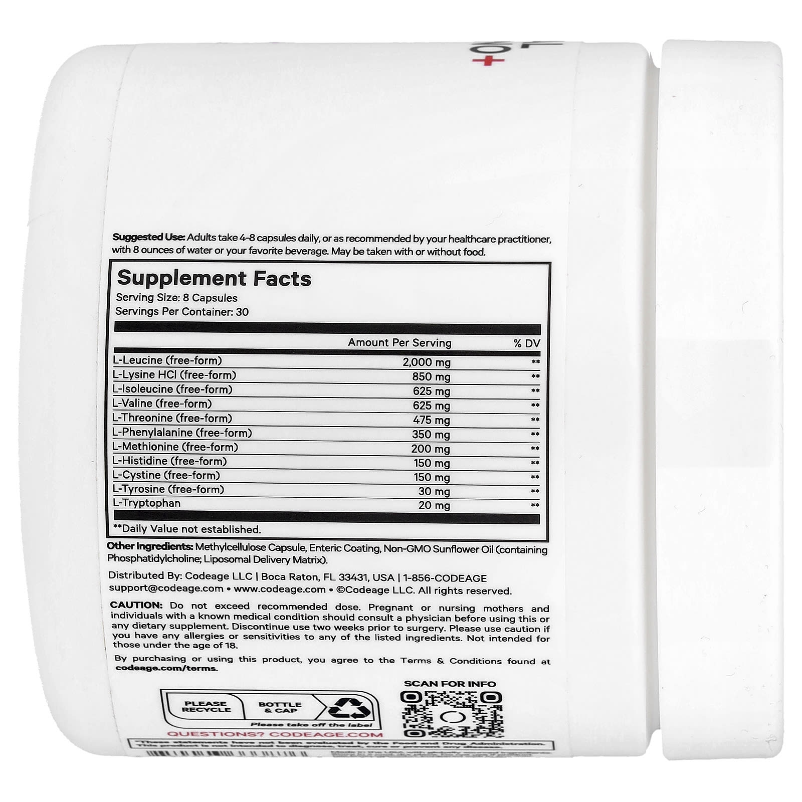 - Эта добавка в форме порошка с BCAA (аминокислоты с разветвлённой цепью) и EAA (незаменимые аминокислоты) имеет липосомальную систему доставки. В состав добавки Codeage с EAA входят L-лейцин, L-лизин гидрохлорид, L-изолейцин, L-валин, L-треонин, L-фенилаланин, L-метионин, L-гистидин, L-цистин, L-тирозин в их свободной форме, а также L-триптофан.