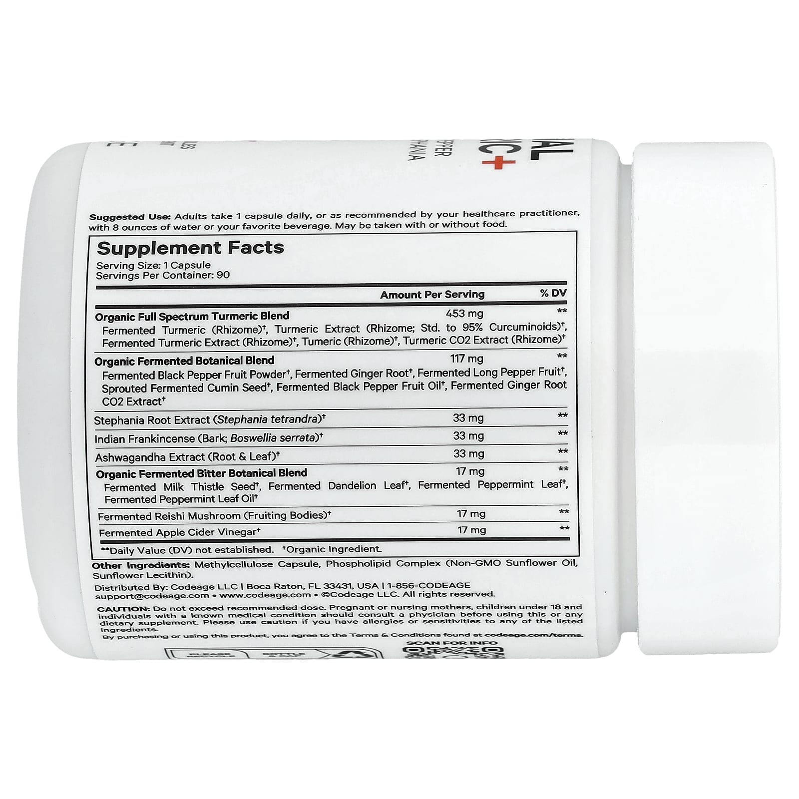 Липосомальная куркума+ от Codeage — это тщательно разработанная добавка, содержащая ферментированный органический куркумин из куркумы и различные органические экстракты.